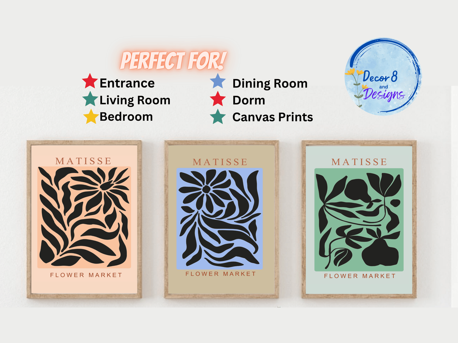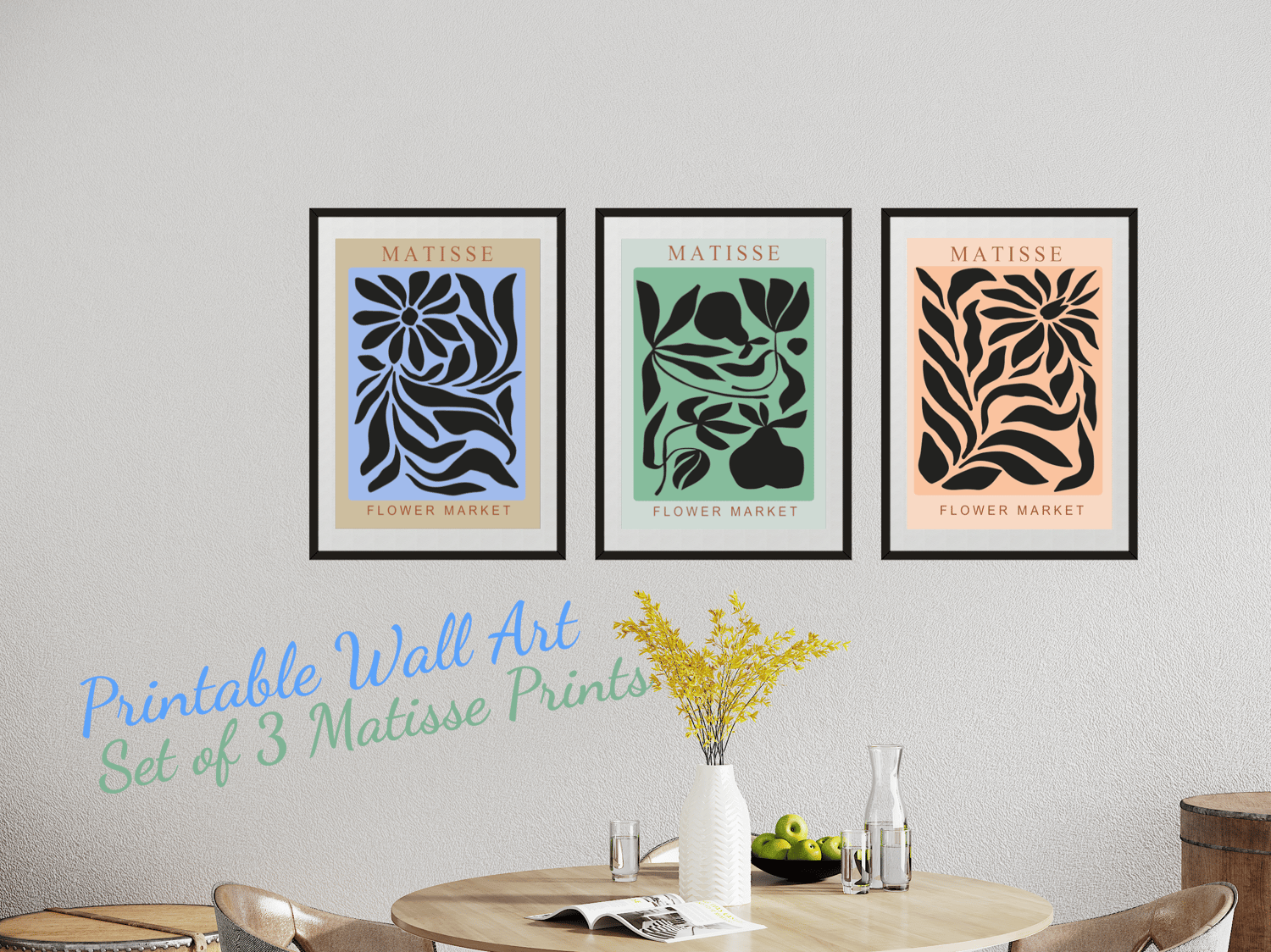 Elevate your space with the timeless allure of this Henri Matisse inspired Black Flower Market Printable Art Set. This exquisite collection features three stunning prints, showcasing black floral designs against vibrant blue, green and orange color backgrounds. Ideal for the living room, dining area, dorm, or entryway, these prints add a touch of sophistication to any space.