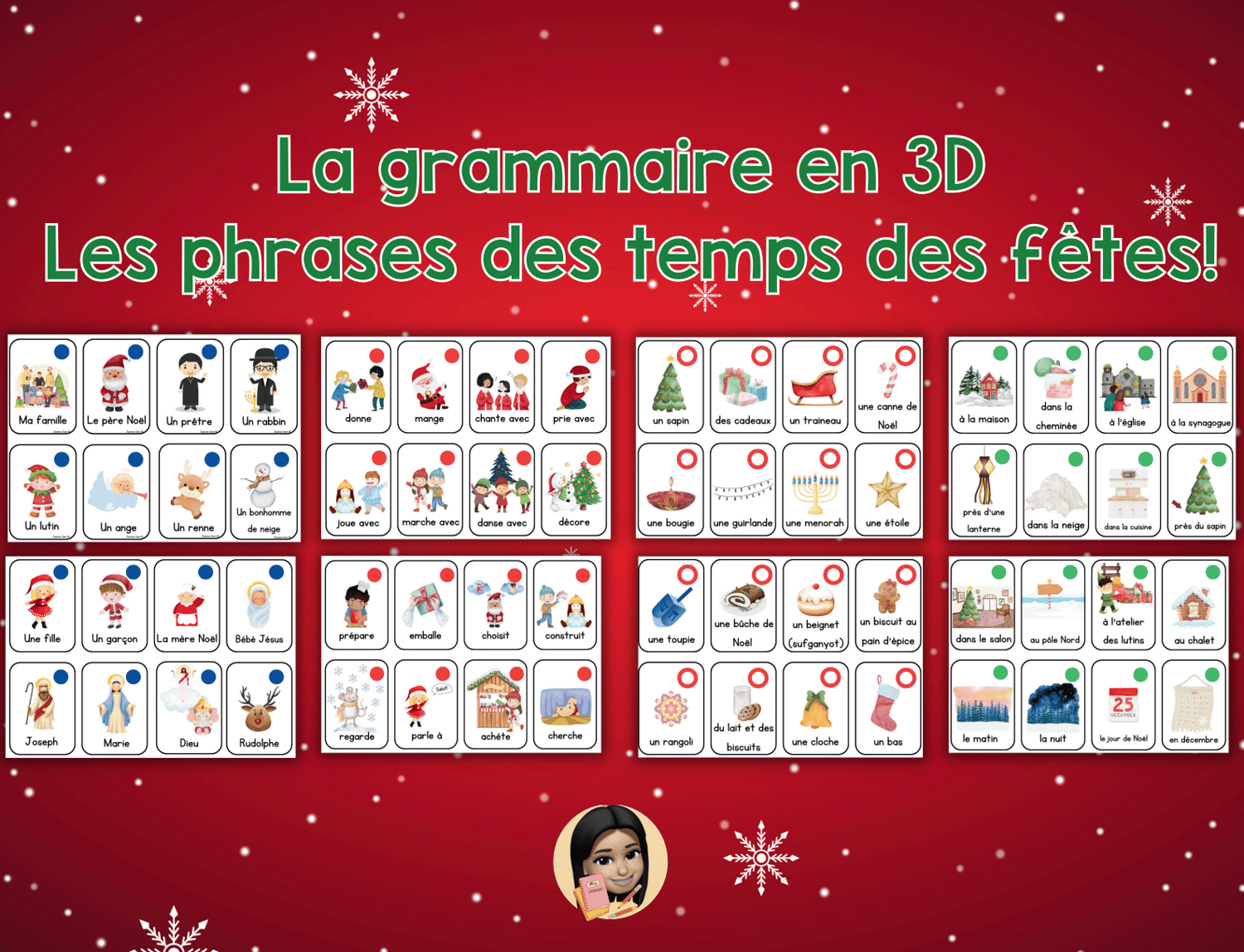 Atelier qui suit le programme « La grammaire en 3D ». Les cartes sont sur le temps des fêtes (Noël, Hannukah, Diwali). Ceci est un document PDF.