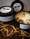 This is a hand-poured soy candle scented with cherries. Hand decorated with sunflower petals and daisy flowers, tiger’s eye and garnet chips.