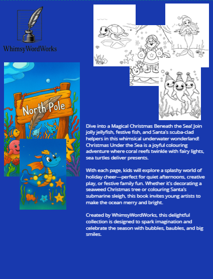 Dive into a Magical Christmas Beneath the Sea! Join jolly jellyfish, festive fish, and Santa’s scuba-clad helpers in this whimsical underwater wonderland! Christmas Under the Sea is a joyful colouring adventure where coral reefs twinkle with fairy lights, sea turtles deliver presents.
