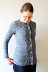 The pattern uses the following techniques: long-tail and knitted cast-ons, cables, German short rows, picking up stitches purlwise, and one-row buttonholes. Ability to work cables from a chart is recommended but written instructions are also provided for the cable panels.Photo tutorials for German short rows and one-row buttonholes are included at the end of the pattern.