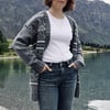The Aparima cardi-jacket is bold and comfortable, featuring textured panels of slip stitches and charted mosaic patterns.