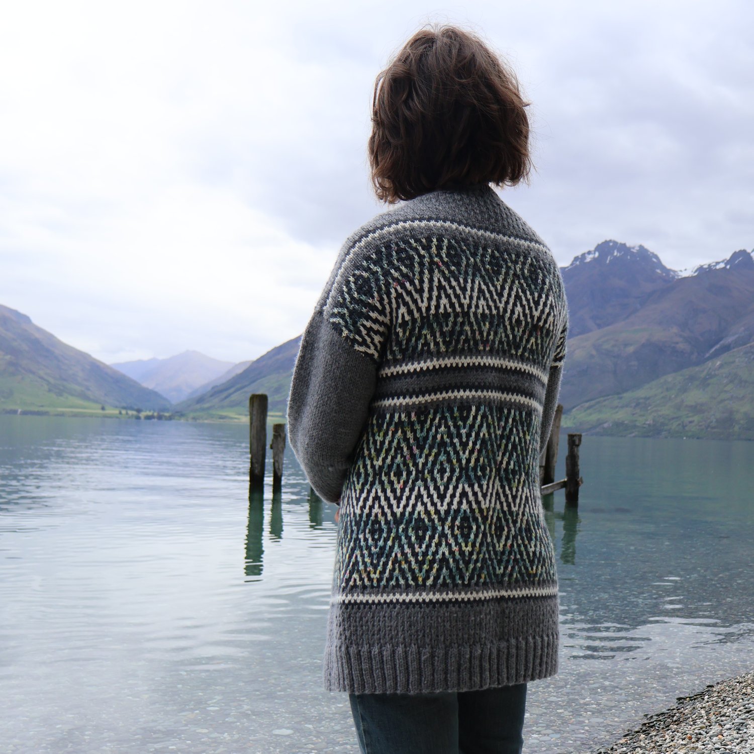 The cardigan is designed to hang open rather than fasten down the front. It is named for a seaside town at the bottom of the world (almost), where the design began