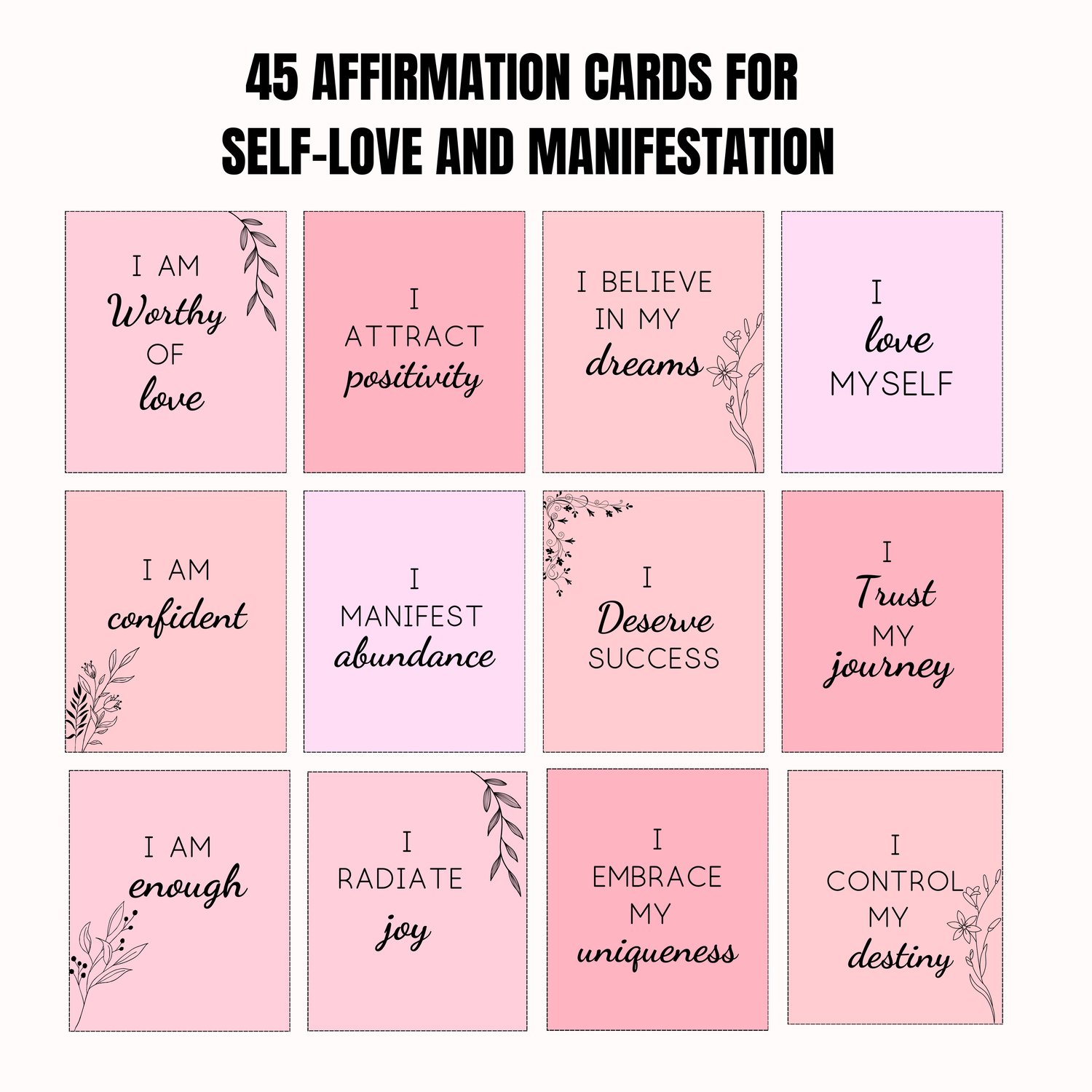 Hey there! Looking for positive affirmation cards to help you manifest your goals and focus on self-care? Look no further! Our set of 45 self-love and self-care affirmation cards is perfect for boosting positivity and enhancing your daily routine. Download now and start your journey to a more confident, self-loving you! 😉