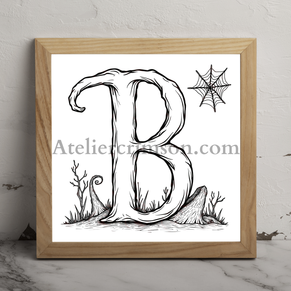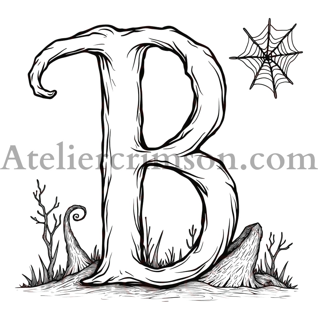 The letter B colloring book jack halloween Tim Burton-inspired alphabet art. Spooky-cute character in coloring book style. Perfect for Halloween crafts or gothic decor.