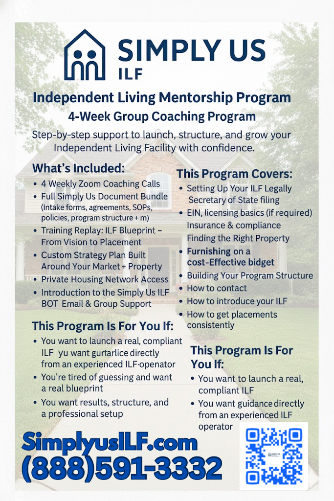 Welcome to Simply Us ILF, the mentorship program that gives you everything you need to open, structure, and grow a compliant Independent Living Facility with confidence. 🏠💼✨