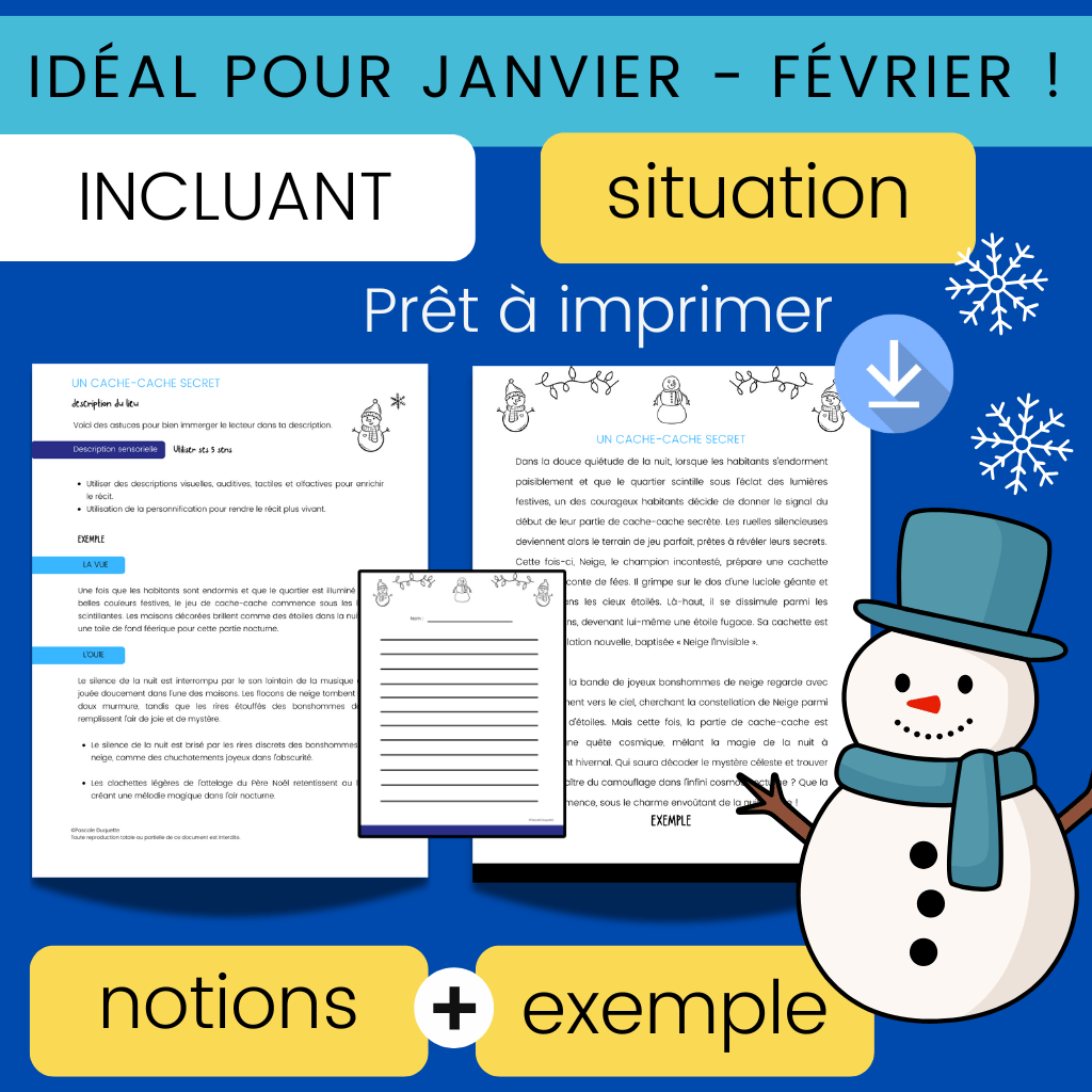 Dans cette situation d’écriture, les élèves doivent décrire la cachette secrète de Neige, le champion du cache-cache annuel. À travers ce défi d’écriture original, ils explorent la description sensorielle et la personnification pour donner vie à un lieu hivernal et créer une ambiance festive.