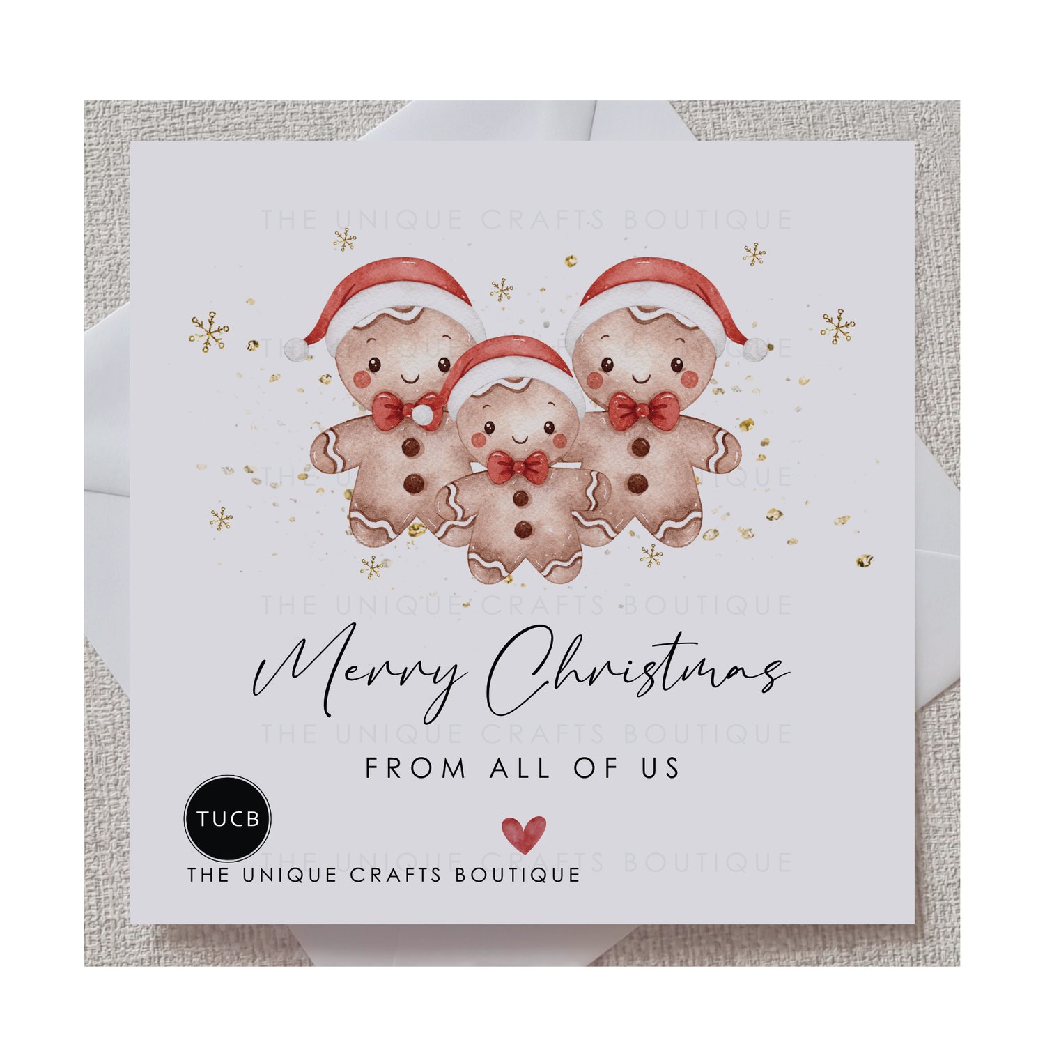 A pack of Ten greetings cards printed with 3 super cute, hand-drawn Gingerbread biscuits surrounded by glitter and snowflakes with the greeting 'Merry Christmas from the all of us' displayed below.