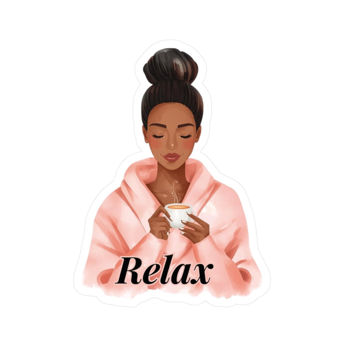 Unwind and take a quiet moment for yourself with this Relax Sticker, featuring a serene woman wrapped in a soft pink robe, enjoying a warm cup of coffee or tea. This peaceful design captures the calm of early mornings and mindful reflection—perfect for anyone who values rest, self-care, and balance.