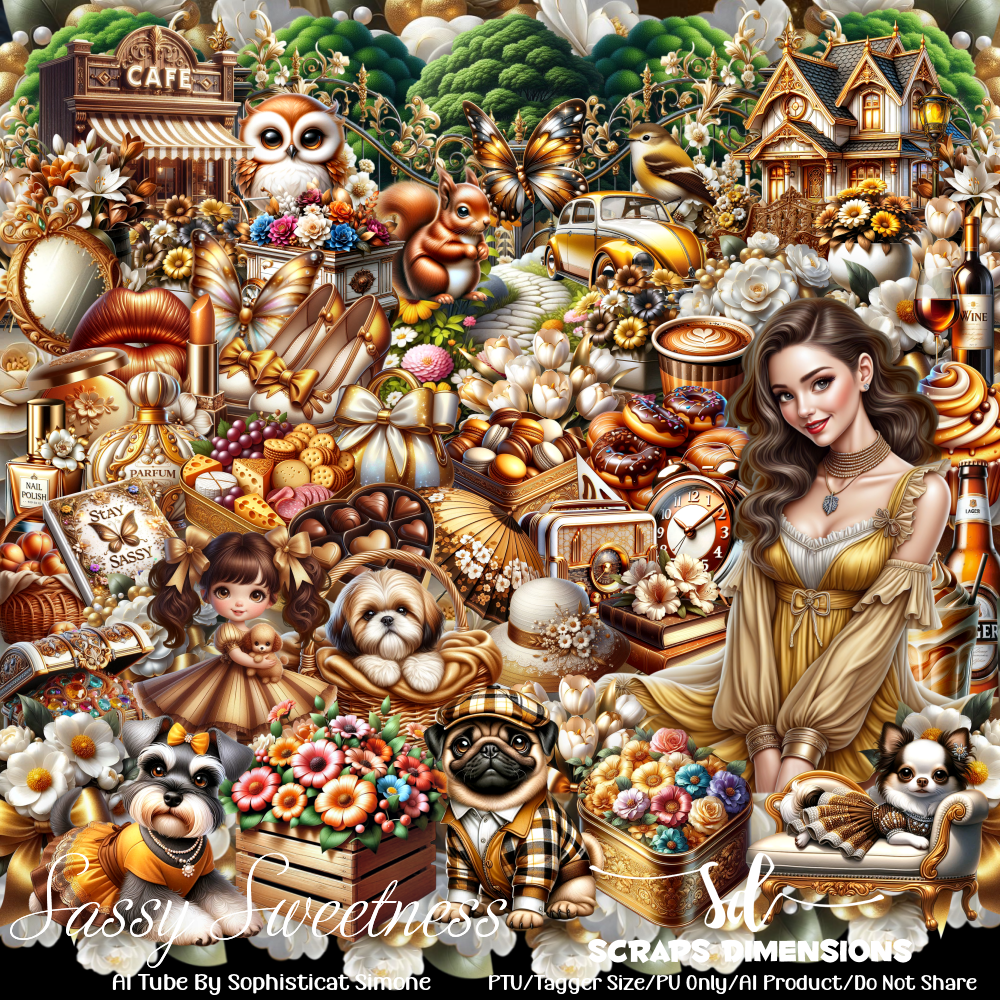 This kit contains 75 fabulous elements, 12 backgrounds and AI tube by Sophisticat Simone. All elements in this kit are AI generated by Scraps Dimensions. Tagger size. Perfect for your tags and projects. Personal use only. Enjoy!