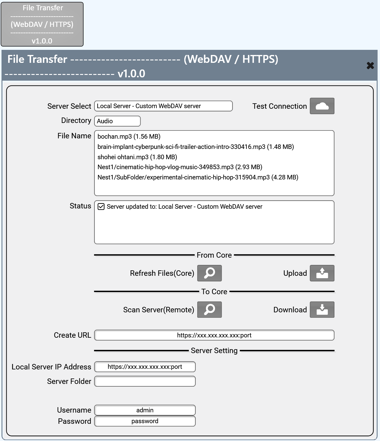 This Q-SYS plugin provides a user-friendly interface for uploading and downloading audio files to and from various cloud or local file storage services. It supports WebDAV, TmpFiles.org, 0x0.st, and custom HTTPS/WebDAV servers.