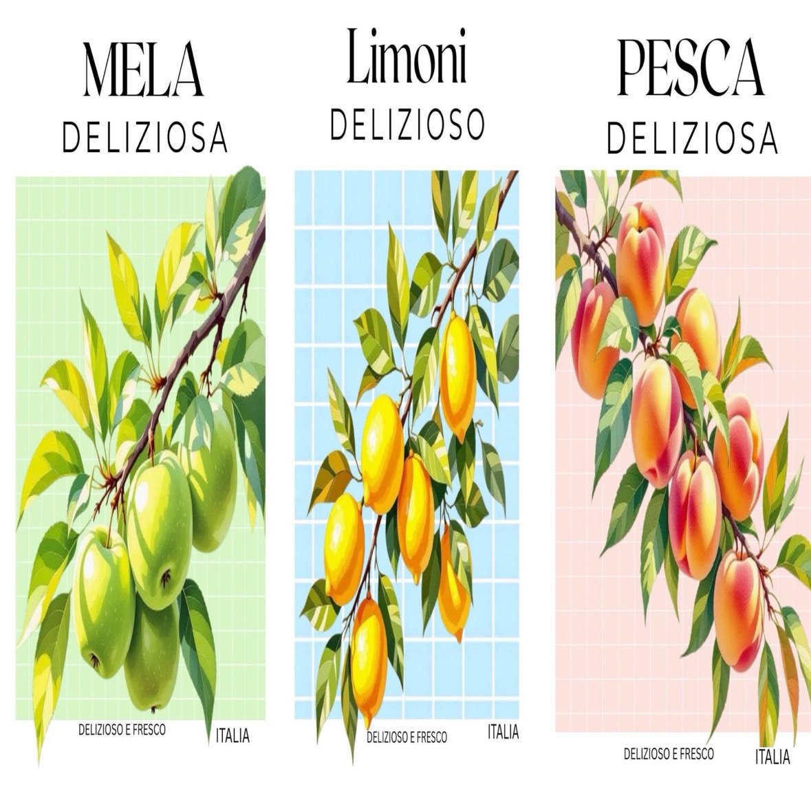 Bring a touch of Italy into your home with this Fruit Wall Art Bundle featuring vibrant lemons, peaches, and apples. Each design is captioned in Italian (Delizioso) and comes in high-resolution PNG format (4500 x 5400 px at 300 dpi)—perfect for printing at home or through a professional print service.