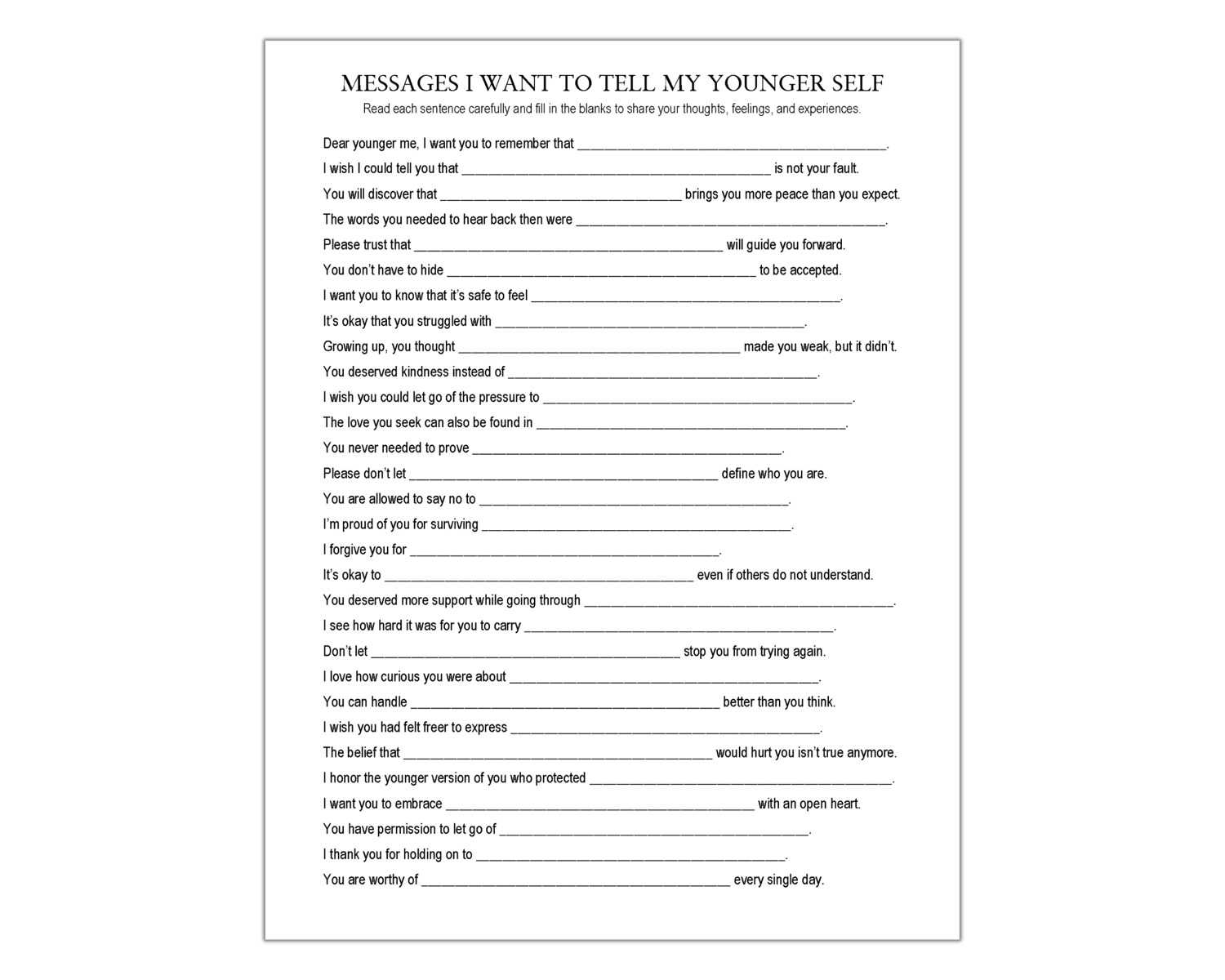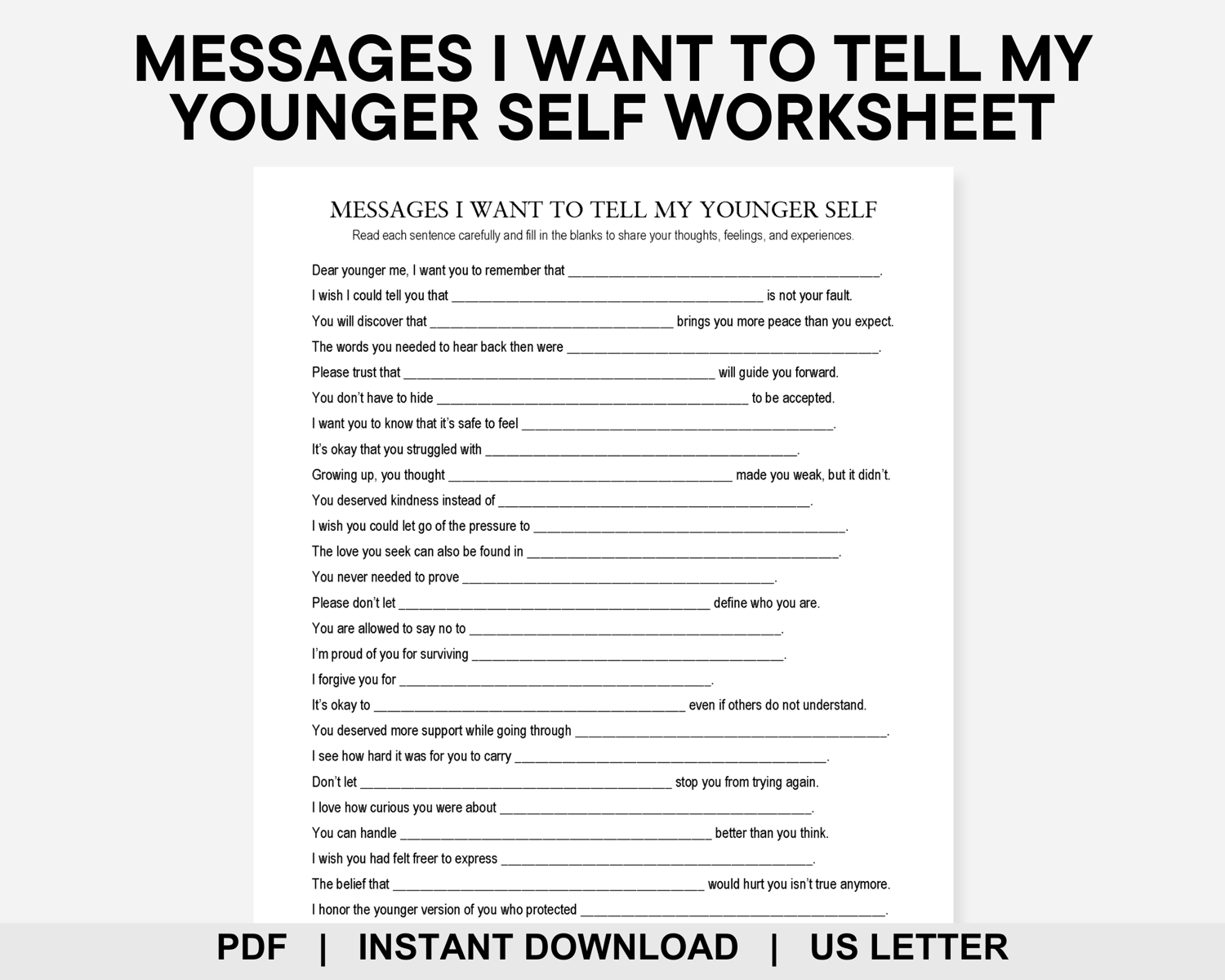Messages I Want to Tell My Younger Self Worksheet, Inner Child Healing, Childhood Trauma, Shadow Work, Self Worth, Self Discovery, Gratitude