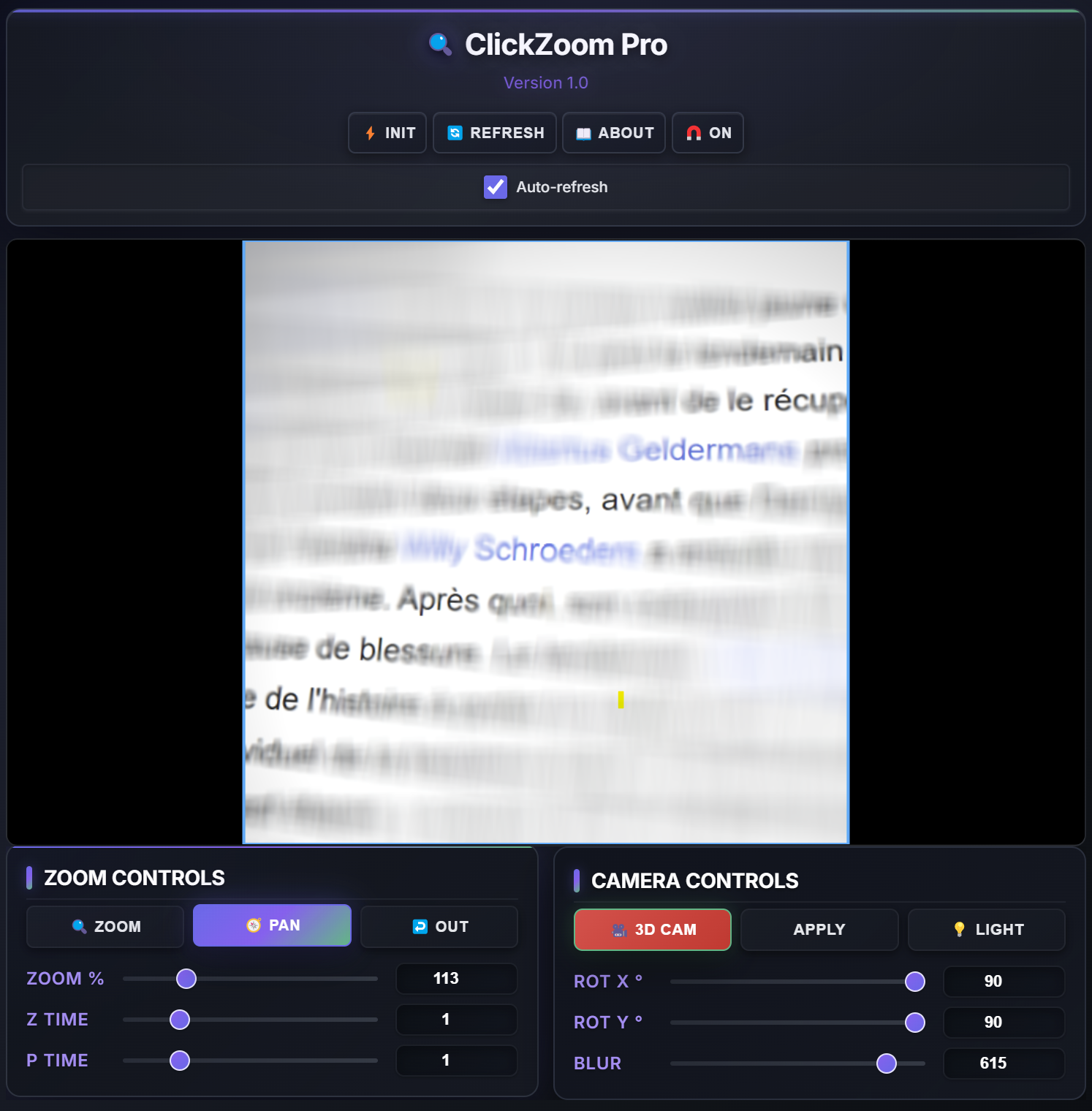 - Fine control: Zoom % (0–200), duration, easing, X/Y rotation, blur
