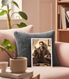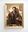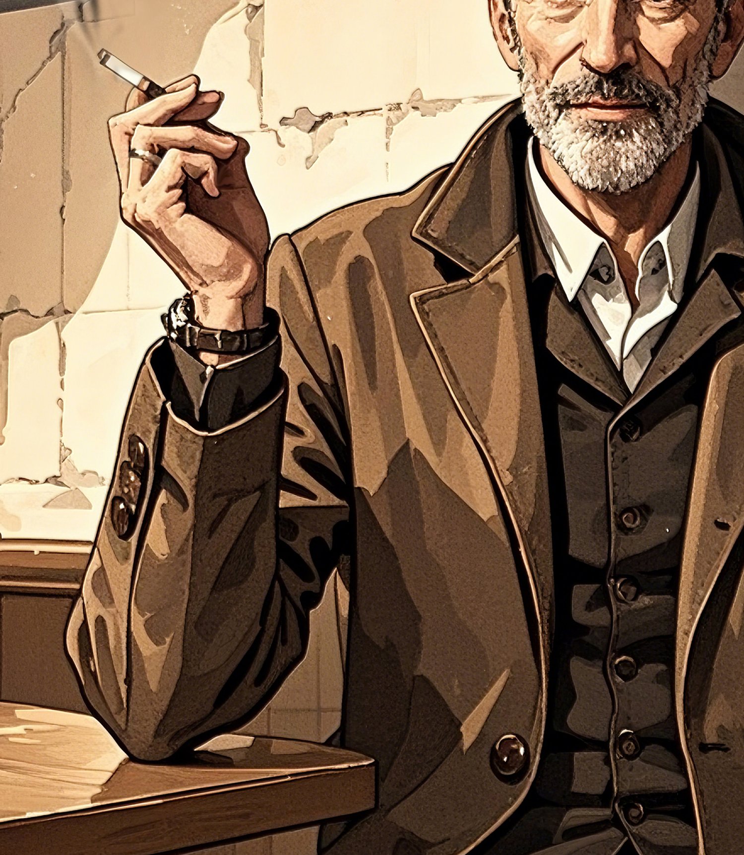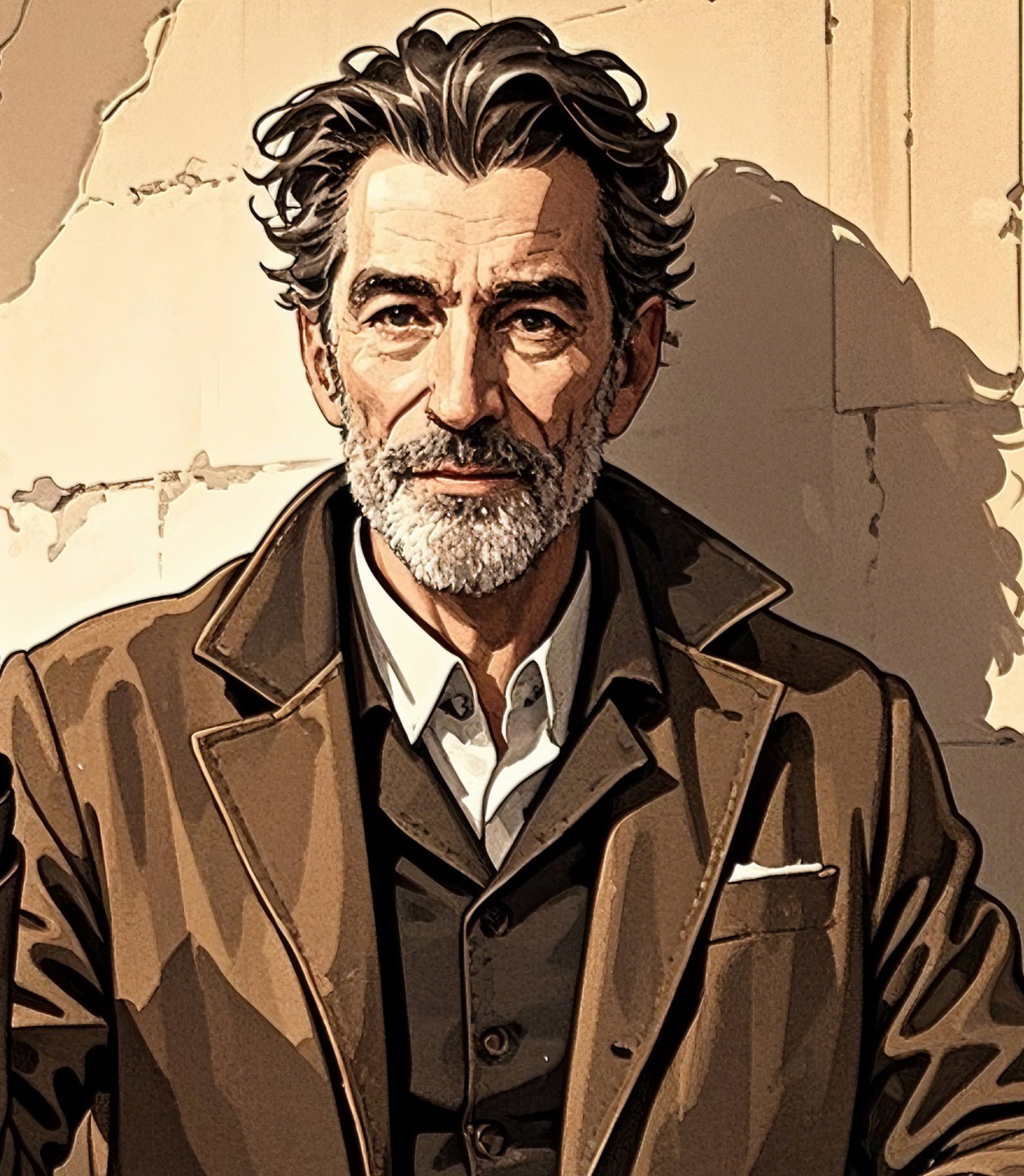 This artwork presents a highly cinematic and dramatic portrait. The muted color palette and soft lighting emphasize the character’s maturity and depth of life experience. The cracked wall and textured background add a narrative layer, hinting at a past full of stories, making the image more than just a simple portrait.