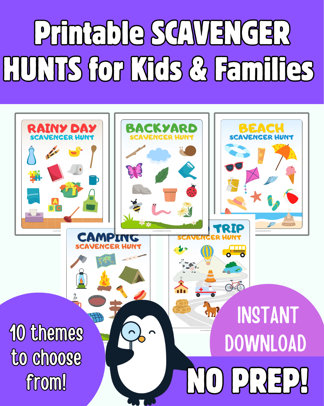 The best part? Our set of 10 scavenger hunt boards is an instant download game that can be easily printed at home, making setup a breeze. Just print out the page you want to use and let the adventure begin! Choose whether your children have to physically locate the items and gather them, or just "spot" them and cross off.