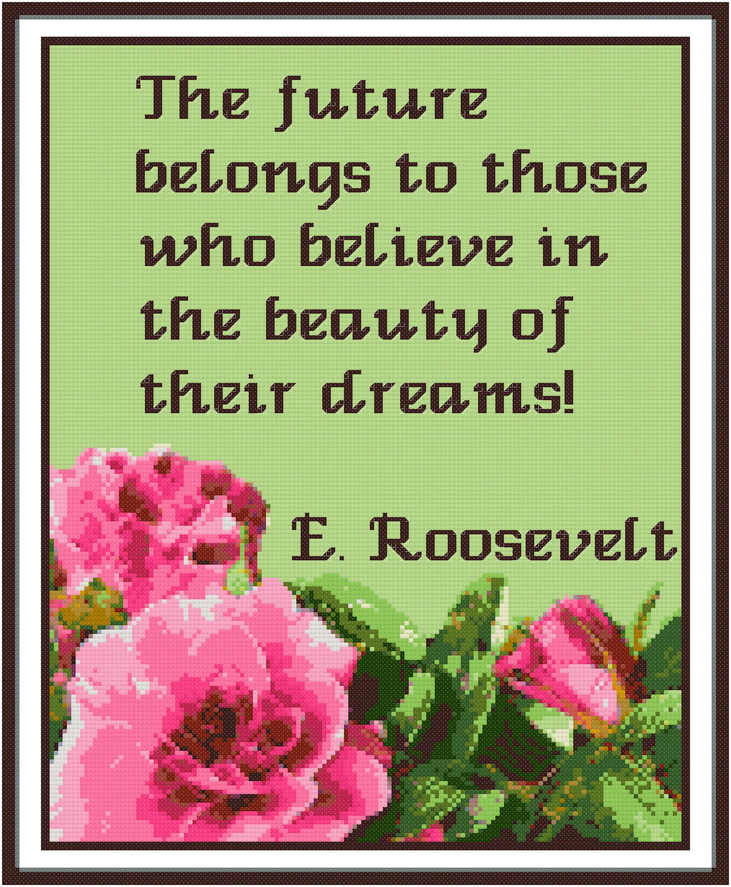 Encouraging words; "The future belongs to those who believe in the beauty of their dreams". This cross stitch sampler maybe stitched on a solid color light green fabric or linen instead of stitching the entire background. Beautiful floral arrangement at the bottom and has a ready made stitched in frame. Easy to do using only full and 3/4 stitches. The pattern is in full color and is easy to follow. Please note: the photo is of the virtual stitches only which has not yet been stitched. This pattern can be downloaded as soon as payment is made. Happy Stitching!