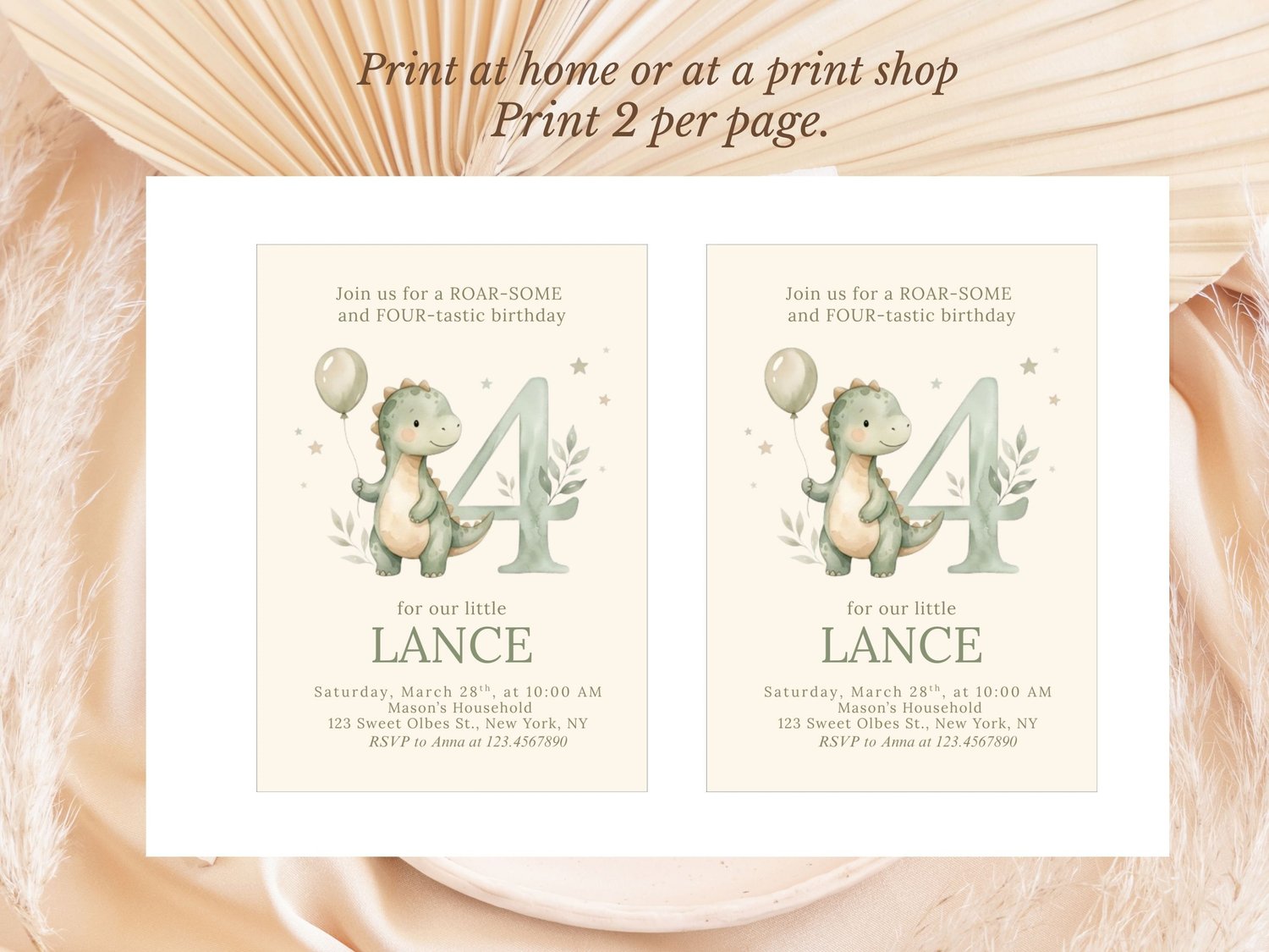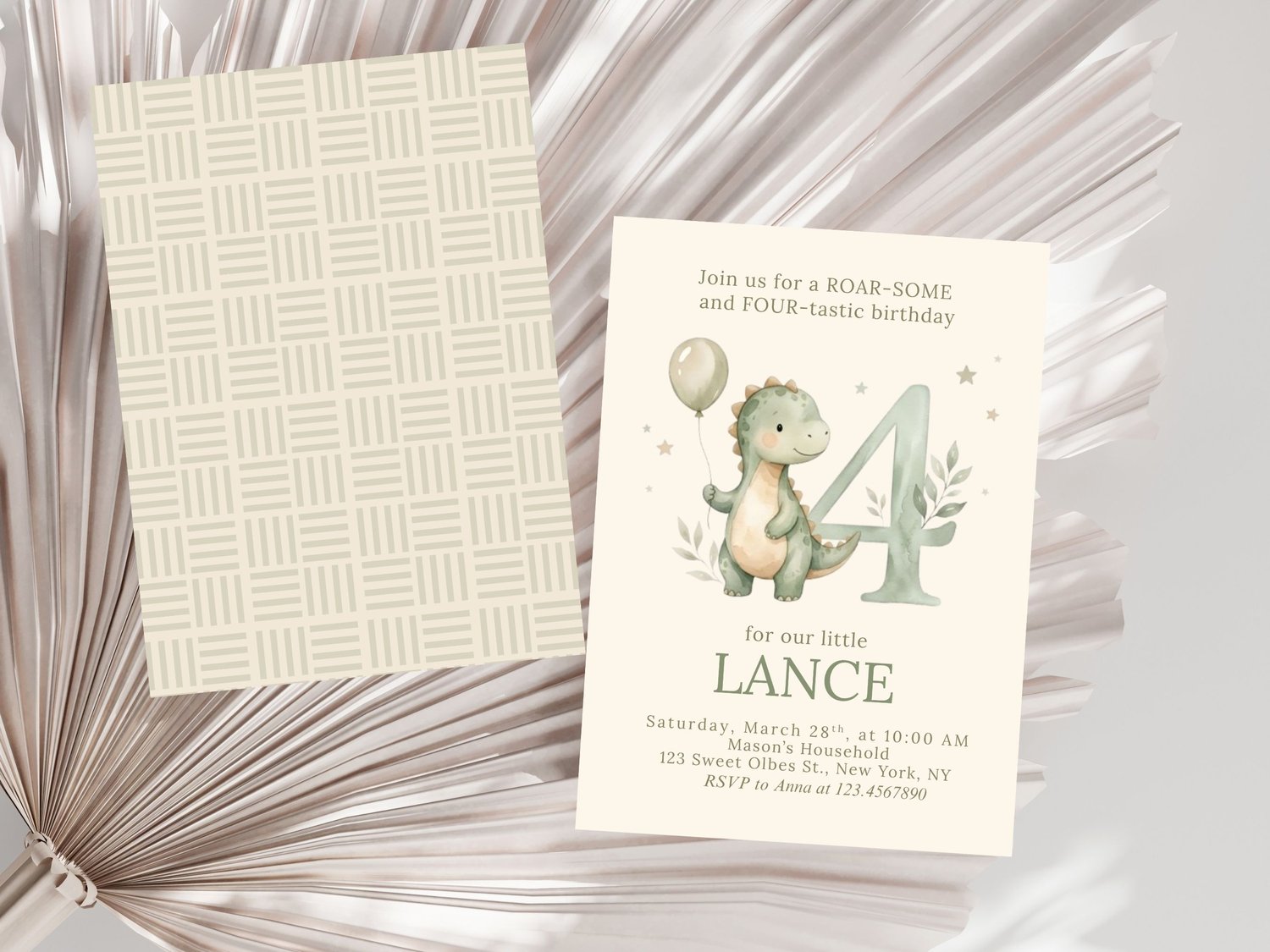 Celebrate your little one’s FOUR-tastic milestone with this adorable sage green dinosaur birthday invitation! Featuring a soft, minimalist design with a cute dino, balloon, and earthy tones, ideal for a modern and stylish 4th birthday party.