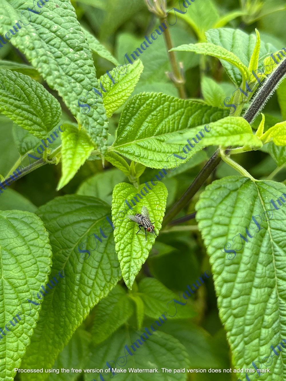 Amateur photograph of a Flesh Fly (Family: Sarcophagidae) relaxing on some green leaves. Flies are extremely difficult to identify to species from photographs, but this one is clearly from the flesh fly family due to its stripes. Image taken in Virginia, USA. Image pixels 3024x4032. Image easily resized as required for buyer needs. Purchase gives image without any watermark.