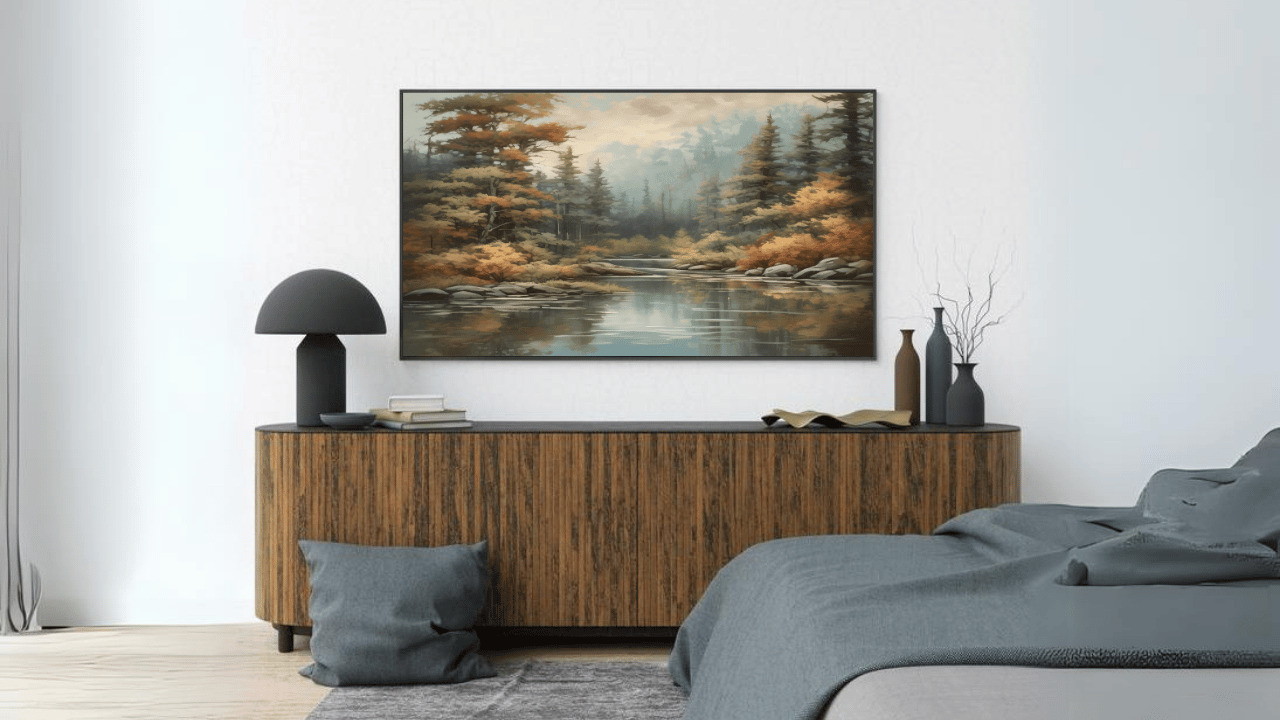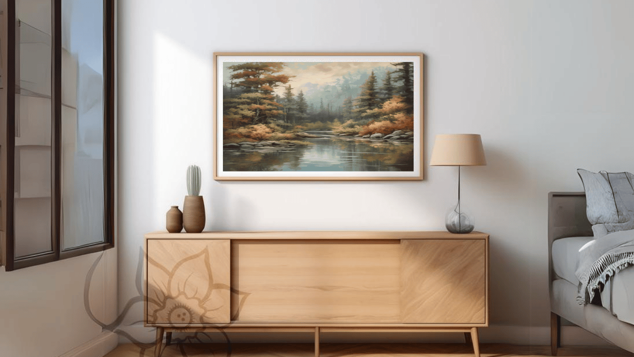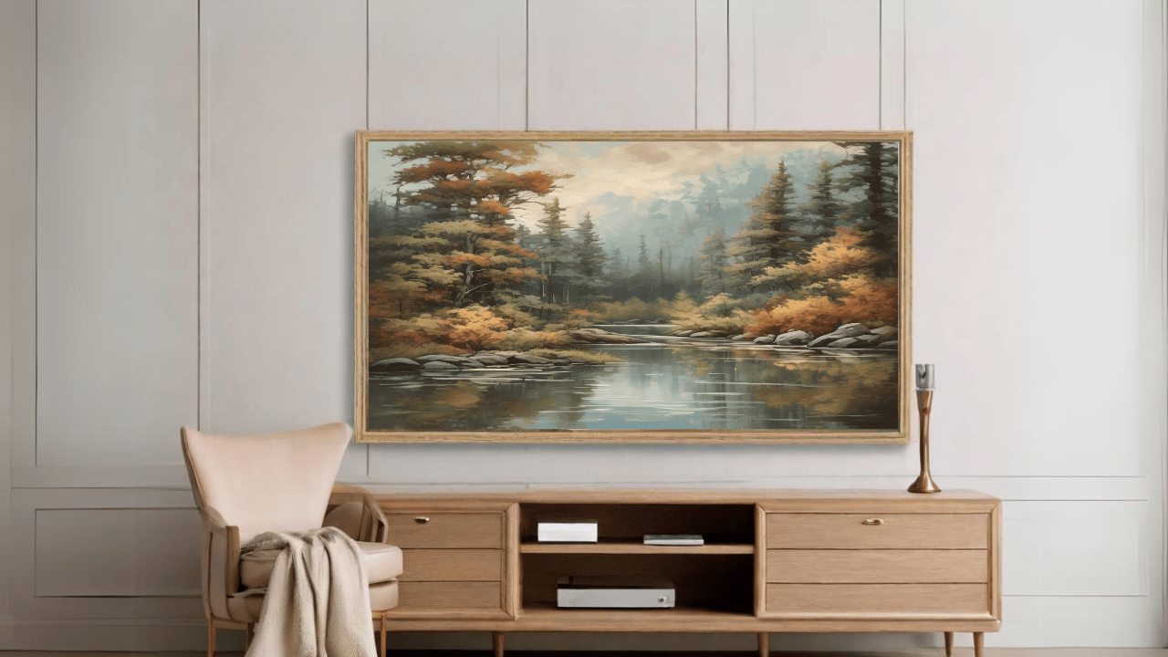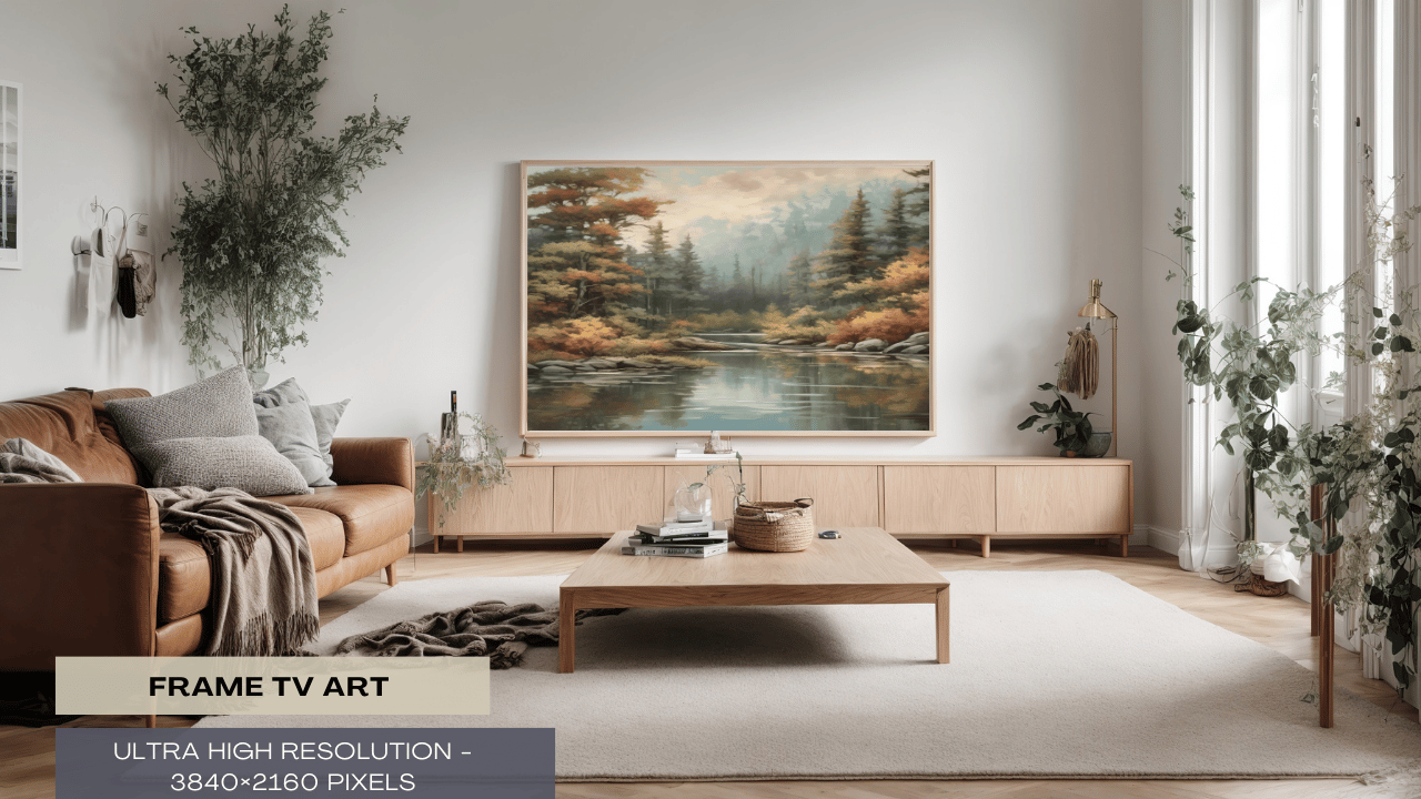 With our retro TV artwork, enter a tranquil forest setting. Take in the breathtaking views that are meticulously rendered with every brushstroke. The gentle, muted colors convey a sense of elegance and tranquillity, while the towering trees and rich foliage bring life to your area. This intriguing artwork will elevate your home entertainment experience by bringing the beauty of nature directly into your living room.