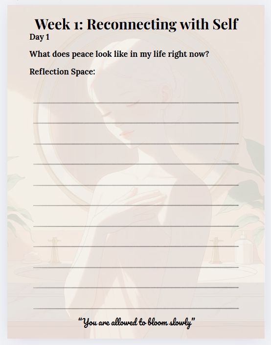 Reflect & Reset is a gentle, guided 30-day self-discovery journal designed to help you slow down, heal, and reconnect with your inner strength — one page at a time.