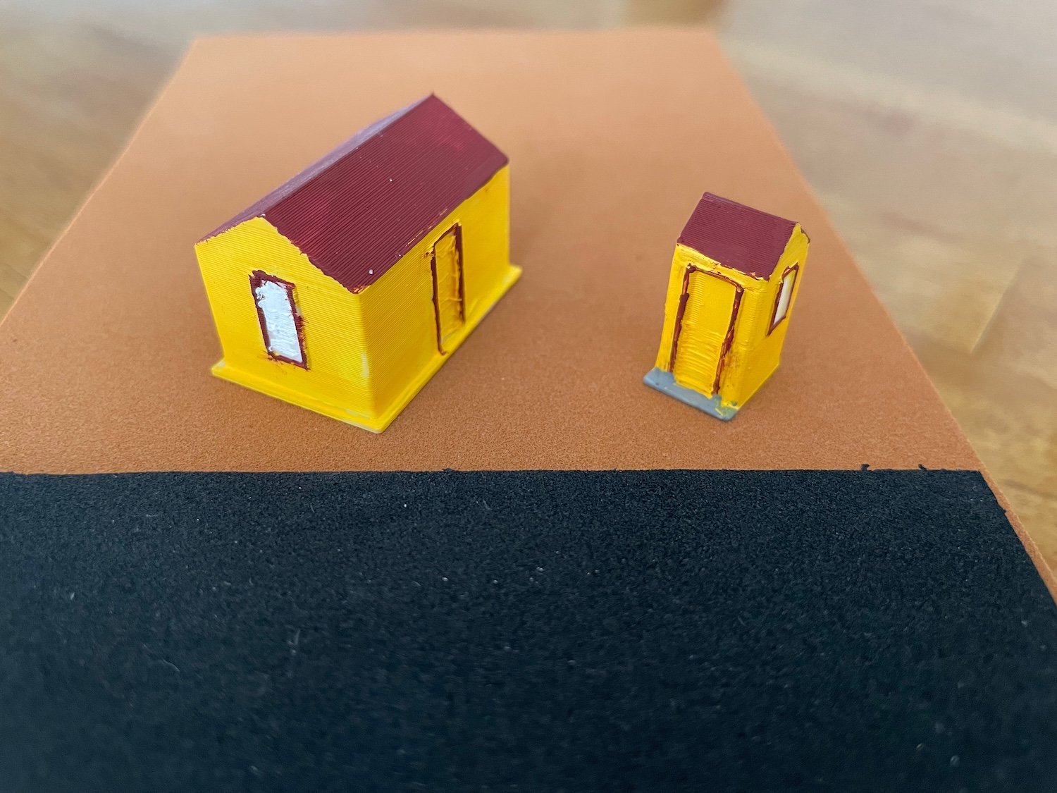 These are a models of: a whistle stop depot (15' by 10'); a crossing shanty (5' by 5'); a speeder shed (18' by 12'); and a general storage shed (10' by 15'). If you wish to add roof overhangs you can put paper or thin card on the roof of each structure.