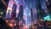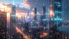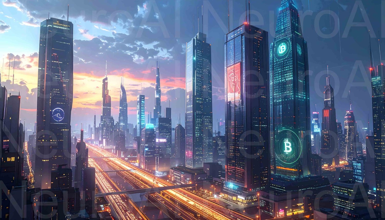 Futuristic skyline with crypto on buildings at sunset