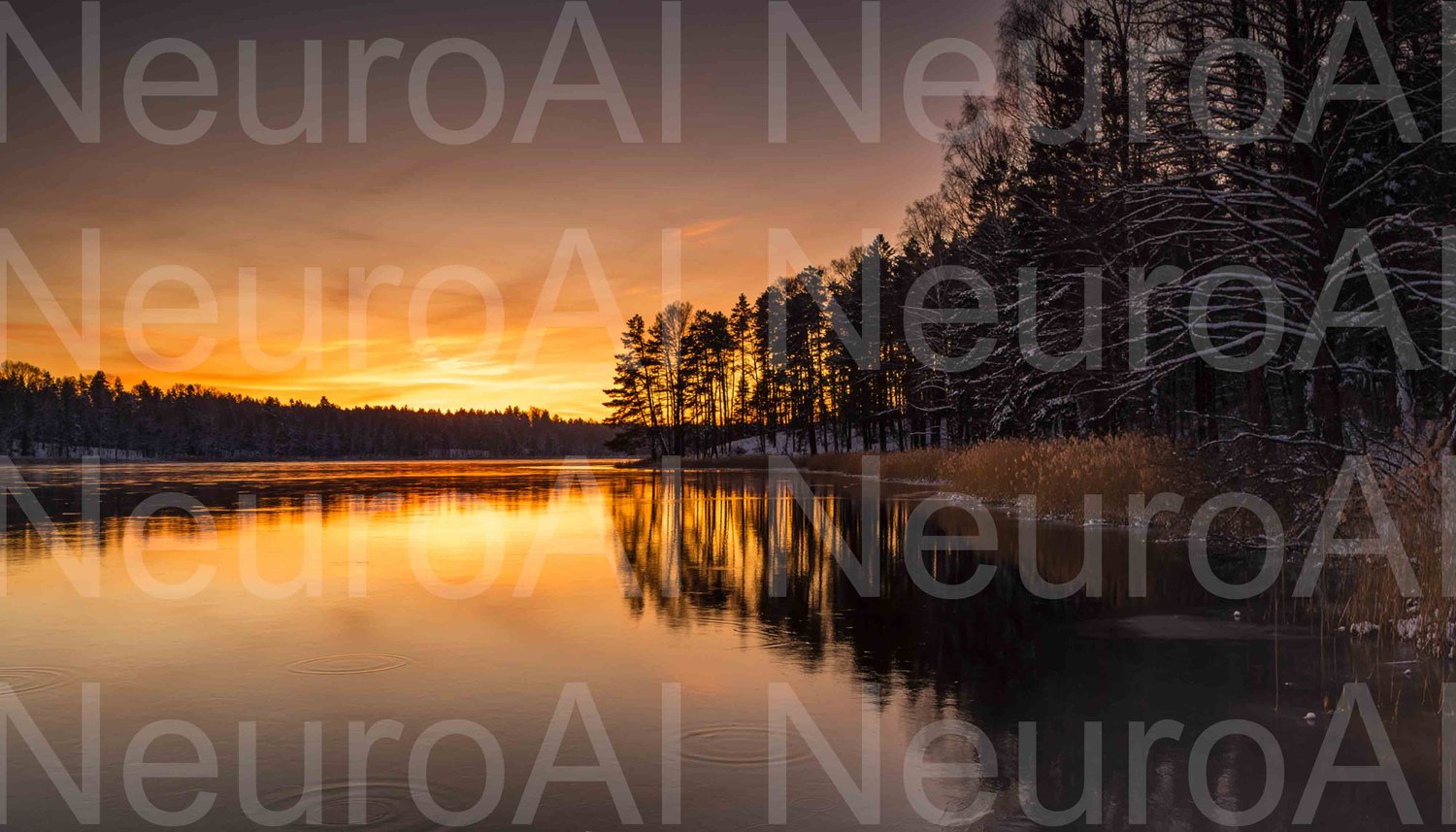 Winter lake sunrise reflecting forest silhouettes