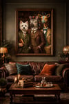 Designed in a detailed oil painting style, this digital artwork captures timeless elegance with a humorous twist.