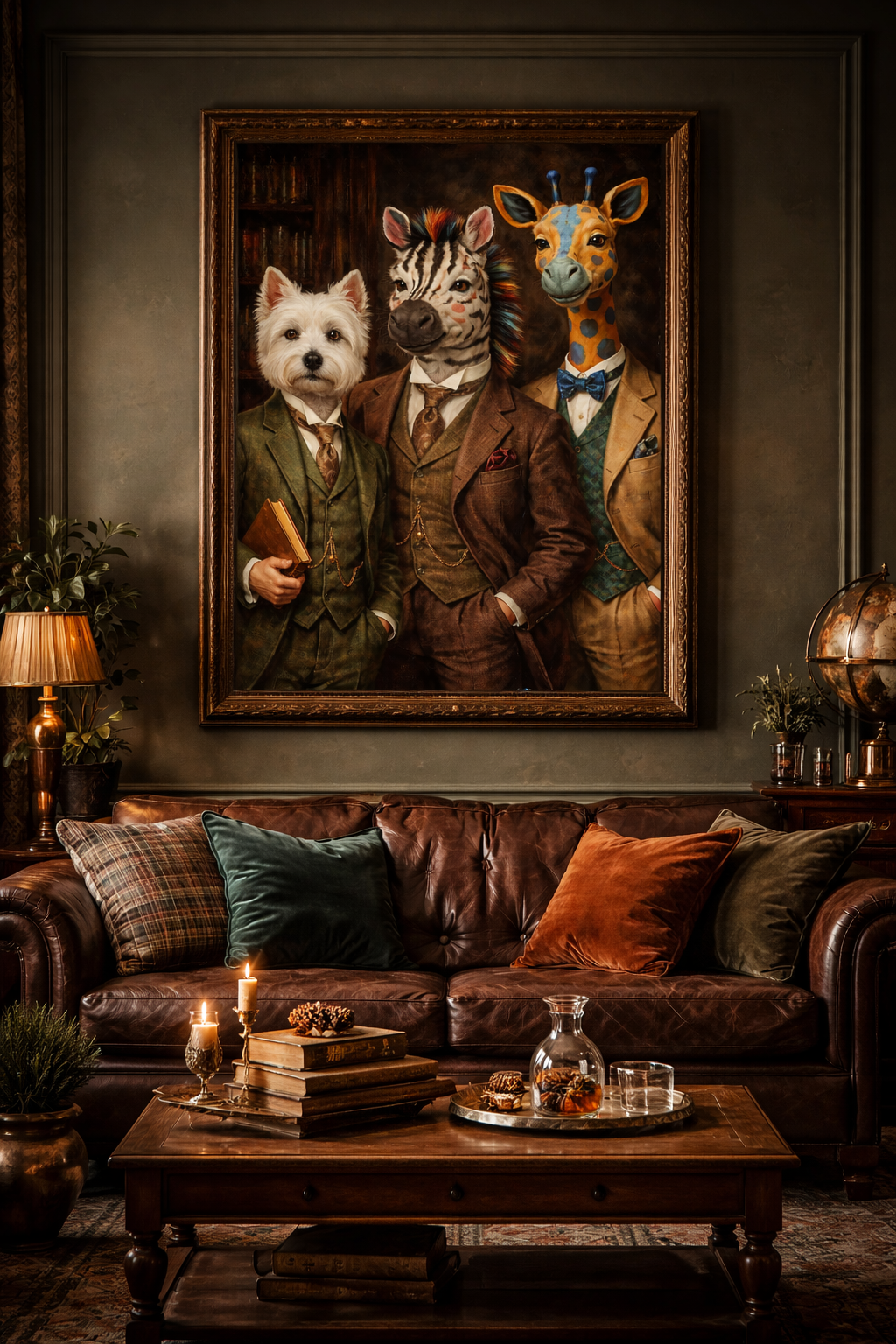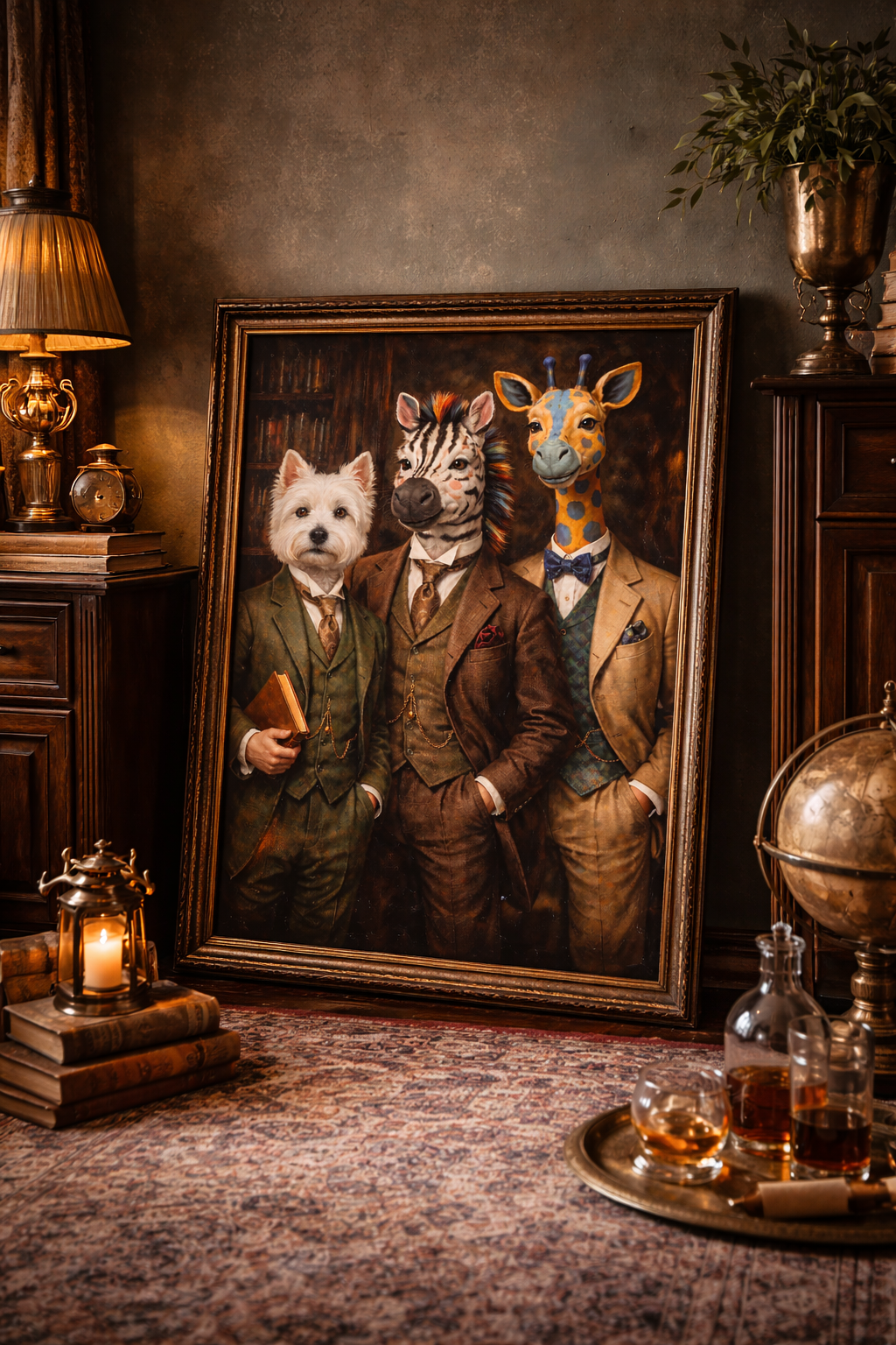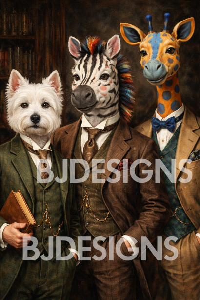 This unique Victorian-inspired animal portrait features a distinguished zebra, elegant giraffe, and refined terrier dressed in classic 19th-century suits. Set against a rich, old-library backdrop, this artwork blends vintage sophistication with playful whimsy β perfect for eclectic interiors and gallery walls.