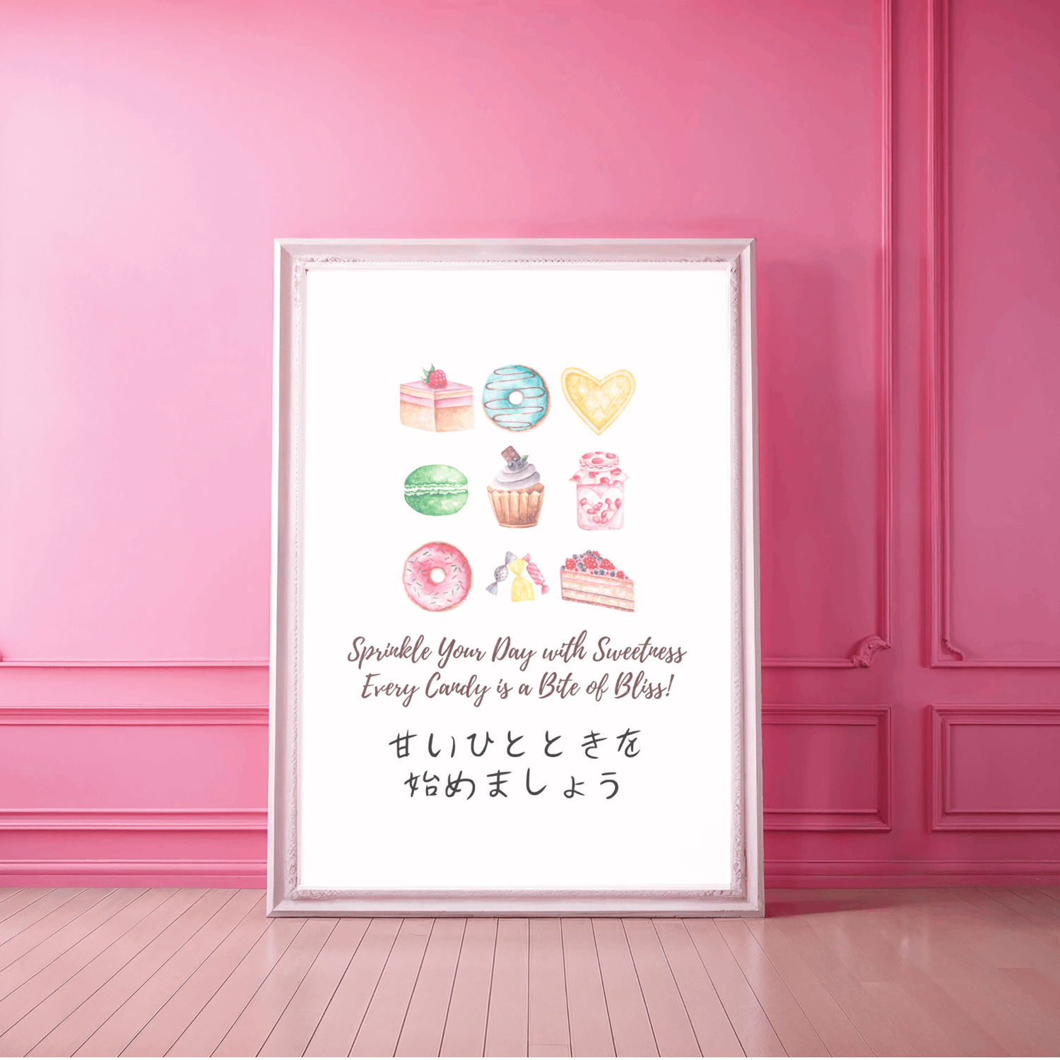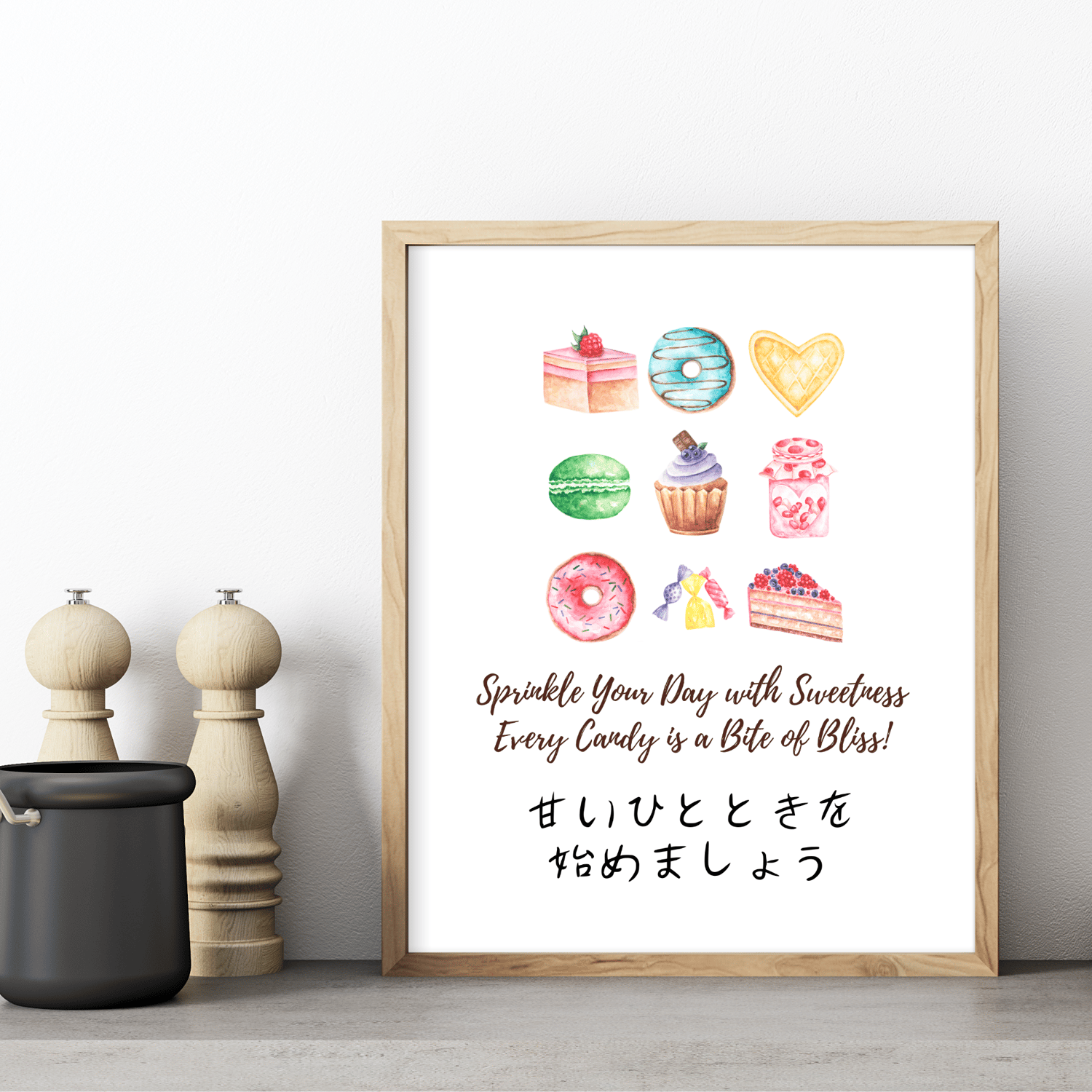 Add a sprinkle of sweetness to your kitchen with this charming wall art featuring adorable desserts. This delightful watercolor print, complete with positive quotes in English and Japanese, is perfect for bringing a fun and uplifting vibe to your kitchen decor. The gentle colors and cute designs make it a joyful addition to any space.