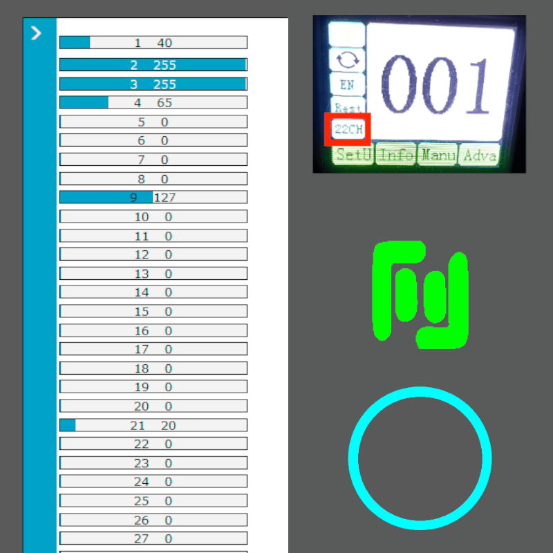 * En el modo de 22CH Verifique, con el Fixture de pruebas de 30CH (click), que coincidan estos canales: 3 Dimmer, 2 Strobo/Shutter, 1 en el Valor 40 = Color Verde, 4 en el valor 65 = Gobo de cuatro Rayas, 9 Foco, 21 en el valor 20 = Aro Celeste (ver cuarta foto).