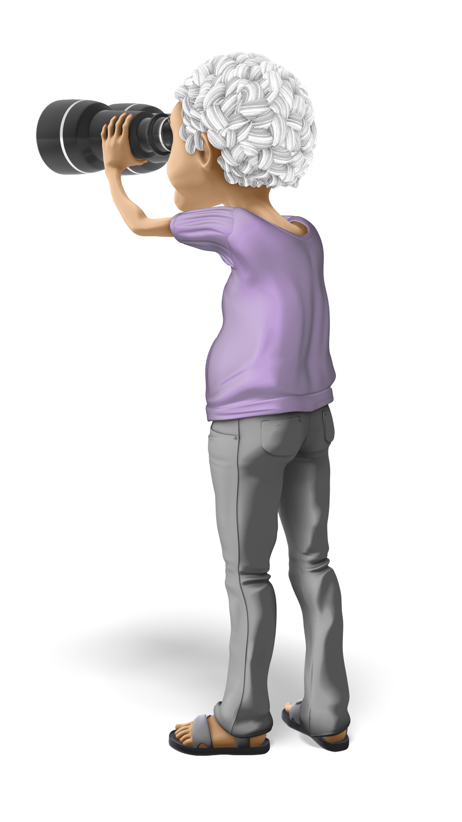 An image of an elderly woman looking off into the distance with a large pair of binoculars. Use this clipart image in presentations involving searching, discovery, and more.