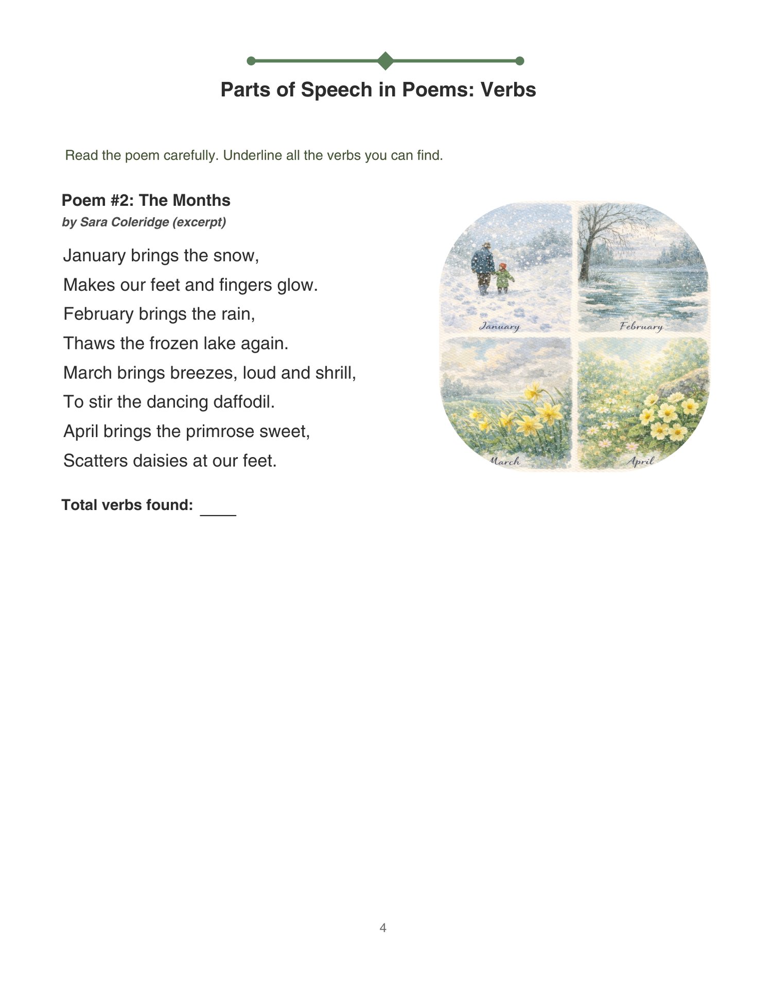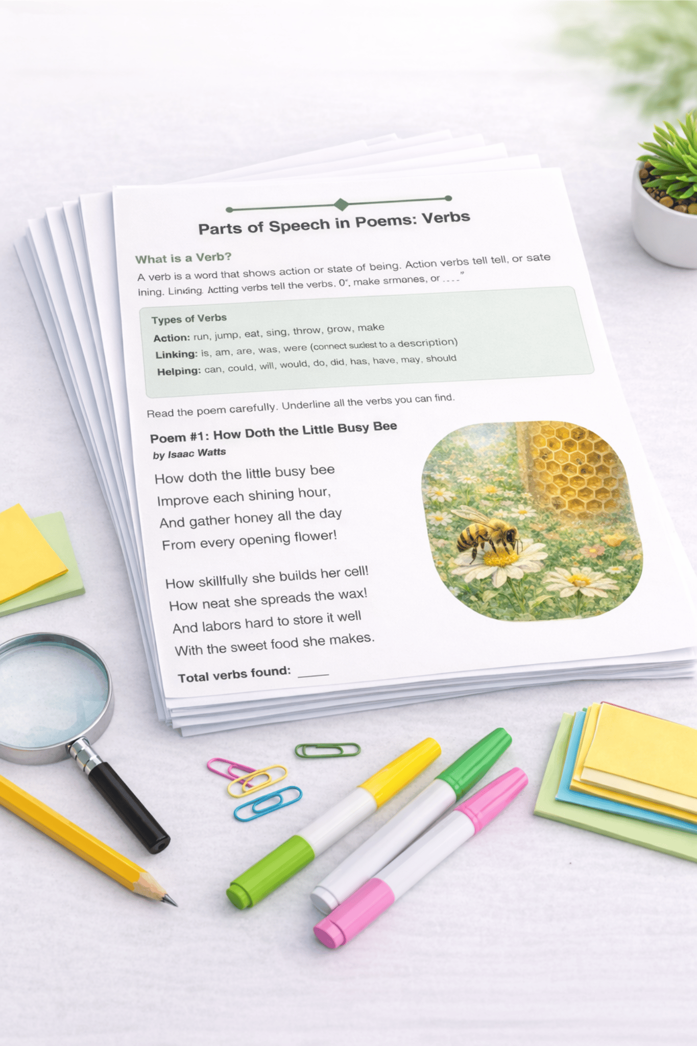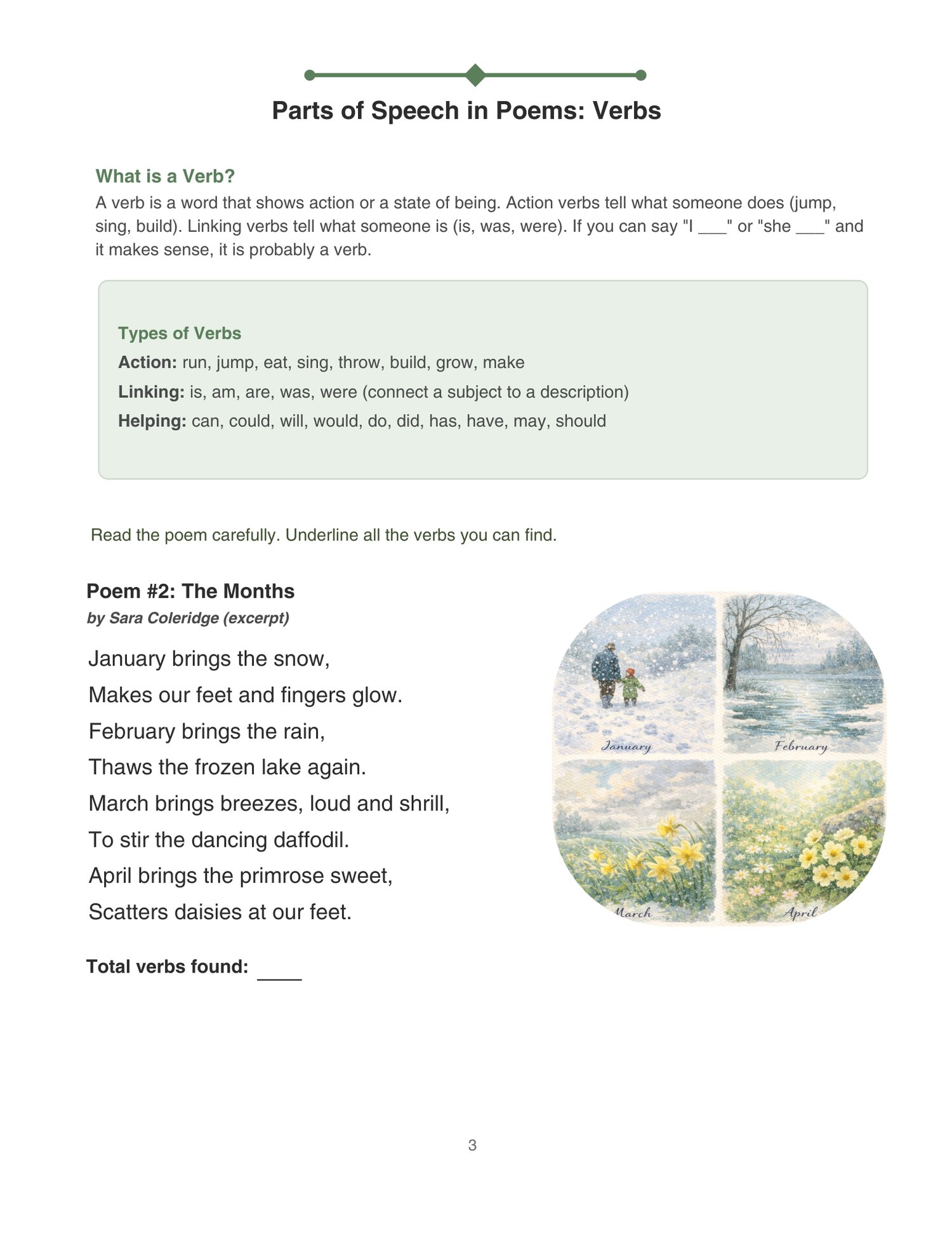 Five carefully selected poem excerpts that bring verbs to life. Students will read beautiful verses while identifying action verbs, linking verbs, and helping verbs that power every sentence. A complete answer key is included for easy grading.