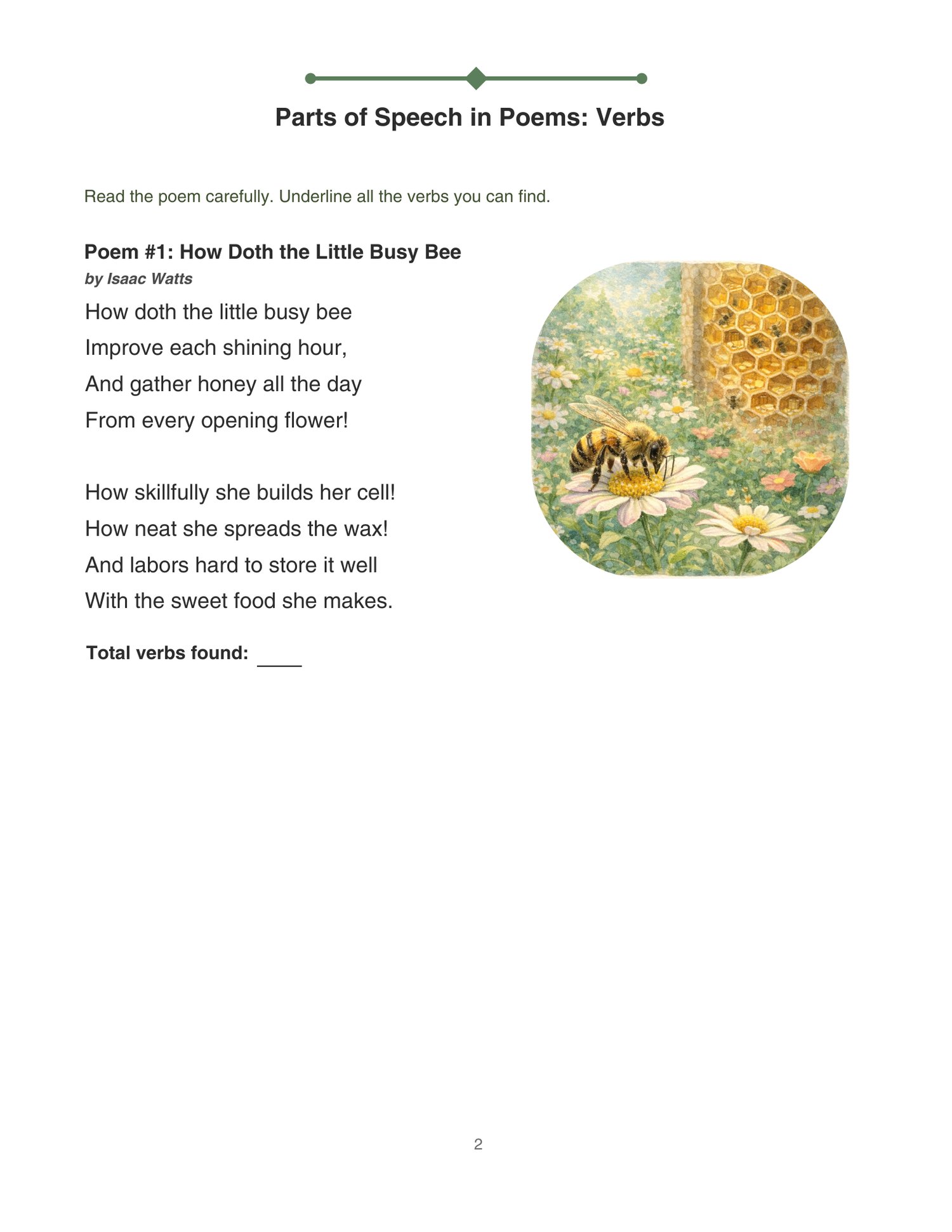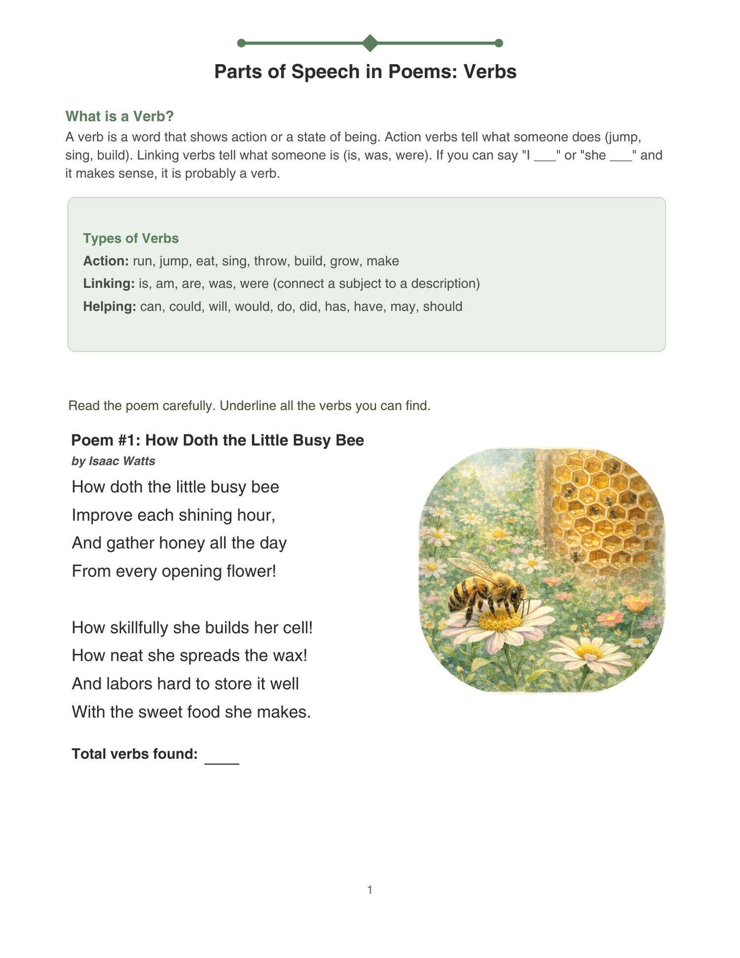 Help your students discover the beauty of grammar through poetry! This engaging worksheet uses classic poems from beloved poets like Isaac Watts, Sara Coleridge, Edward Lear, and Henry Wadsworth Longfellow to teach verbs in a meaningful and memorable way.