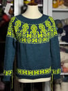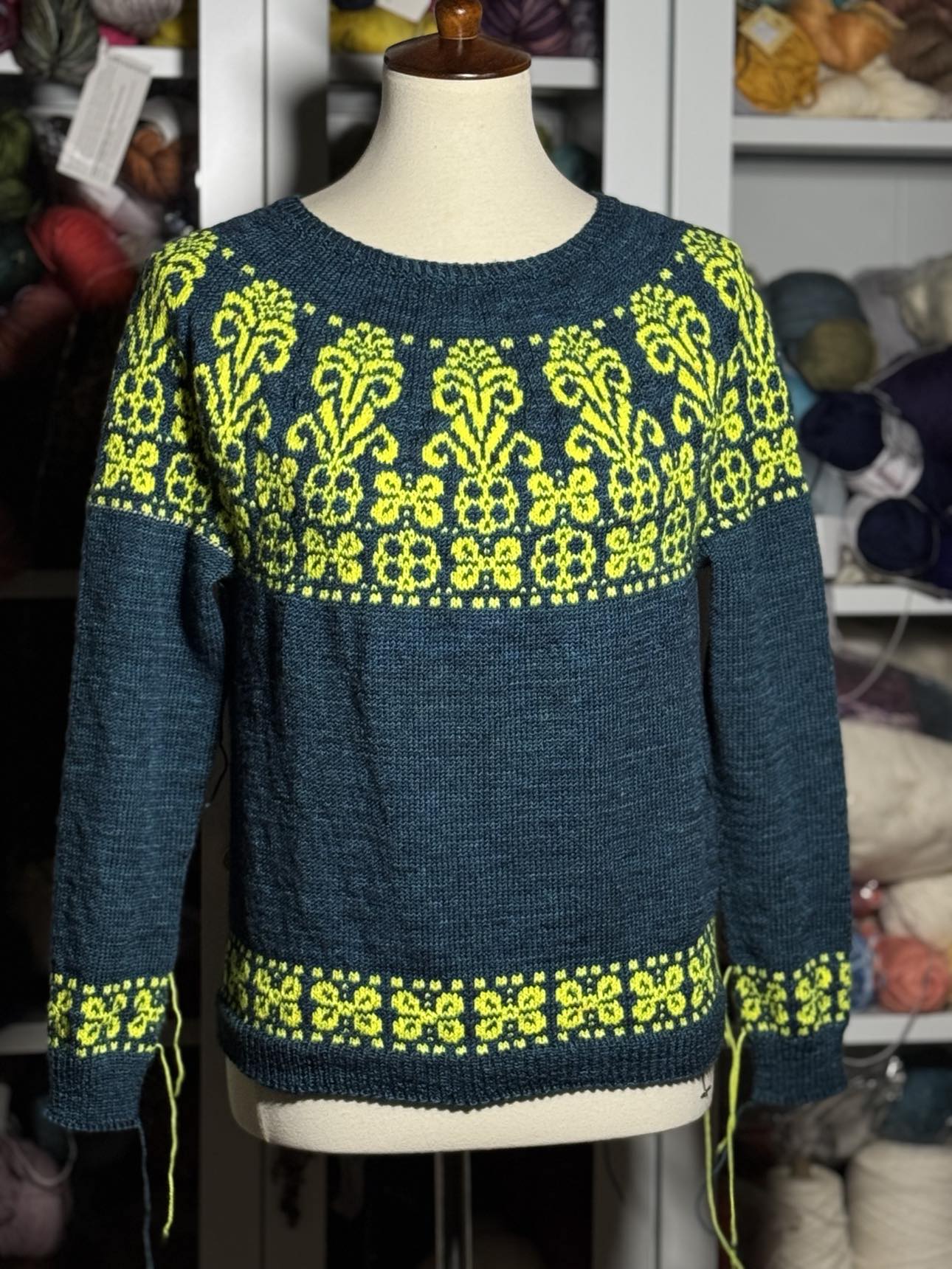 Delicate decorative colorwork bands sit just above the hem and cuffs, adding a graceful finish beyond the traditional ribbing.