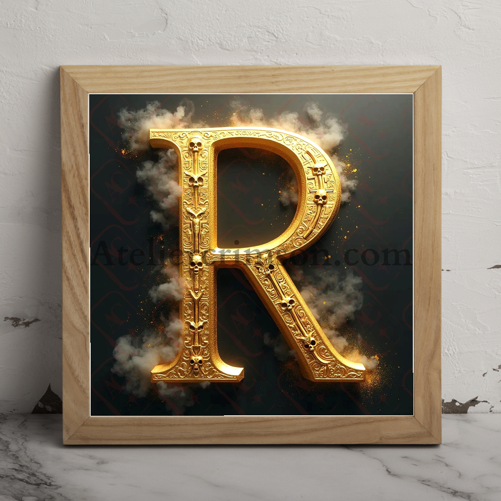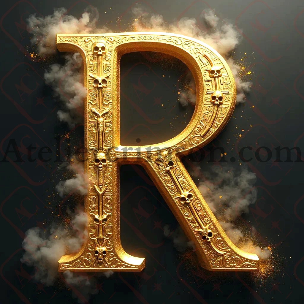 The letter R gold maya skull Skull-inspired engravings, hyper-realistic rendering. Mystical atmosphere with subtle smoke effects. Perfect for high-end typography and design projects. GoldTypography LuxuryDesign SkullArt"