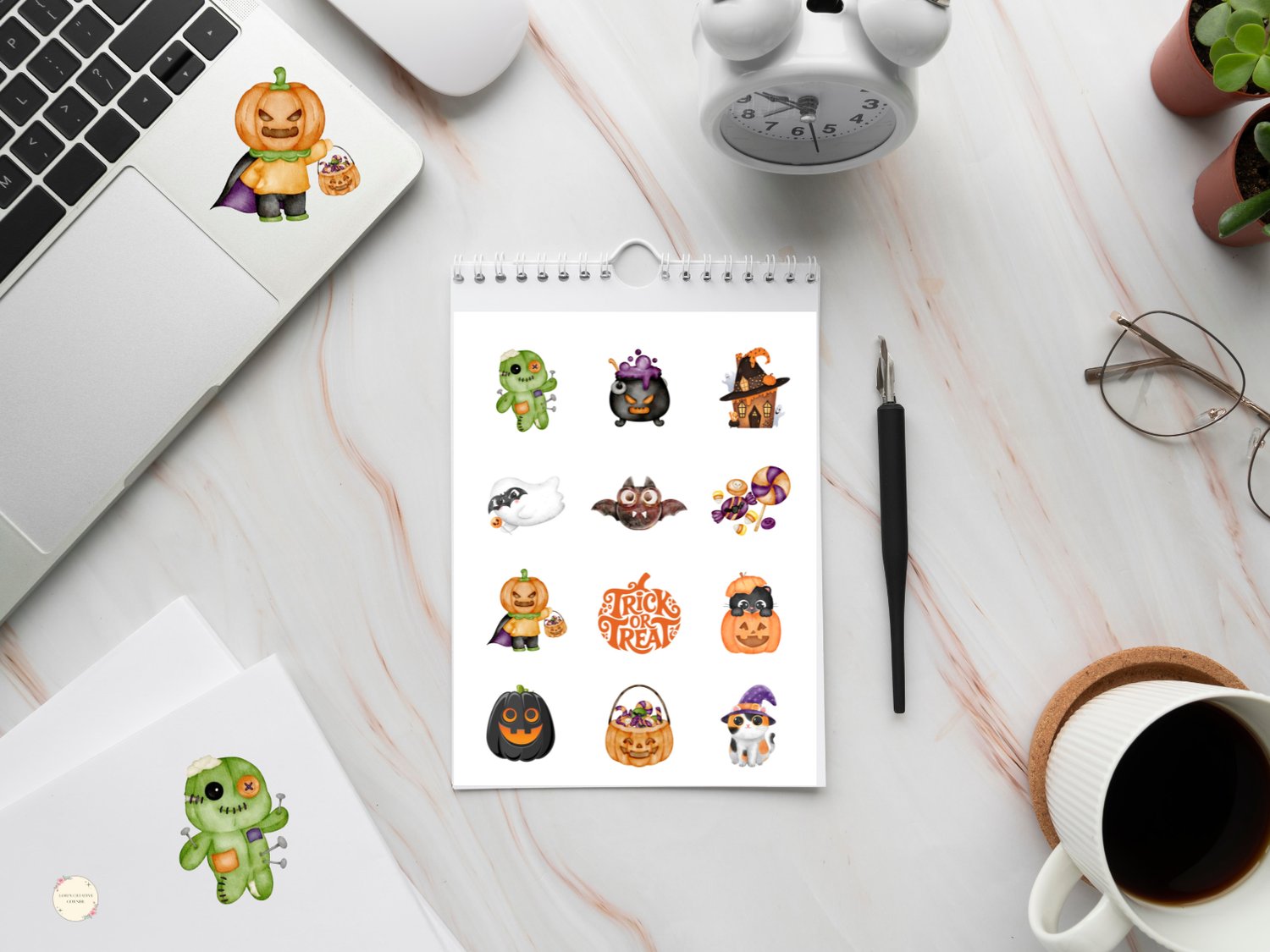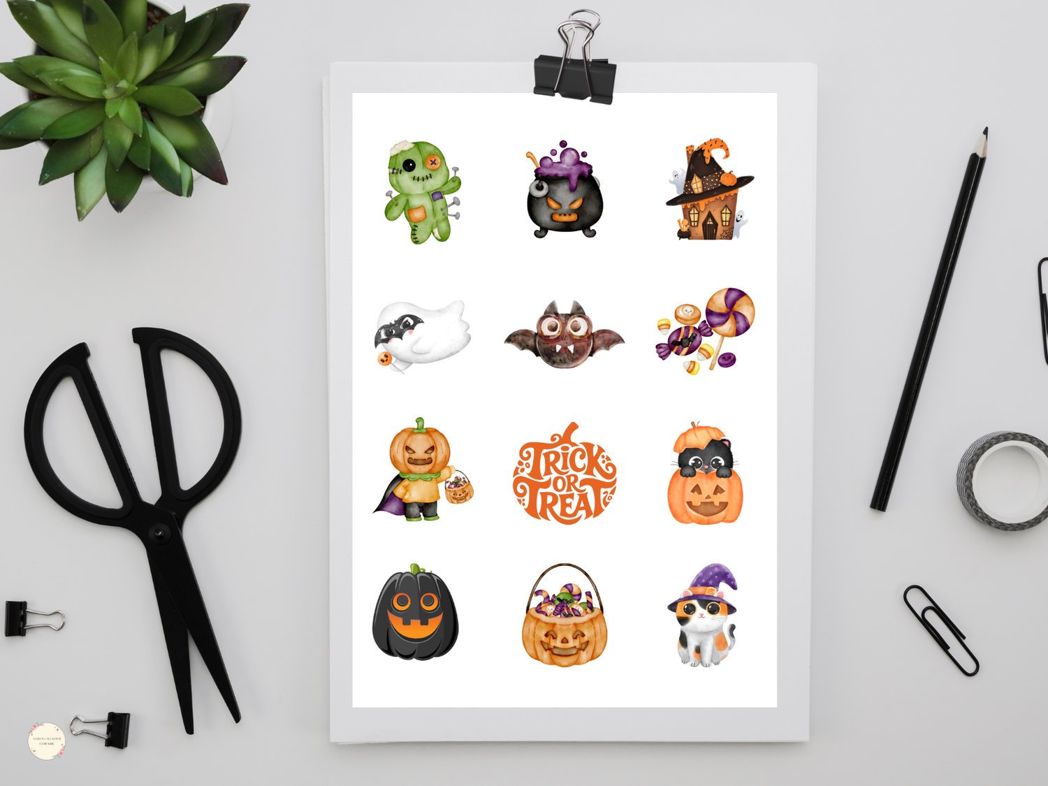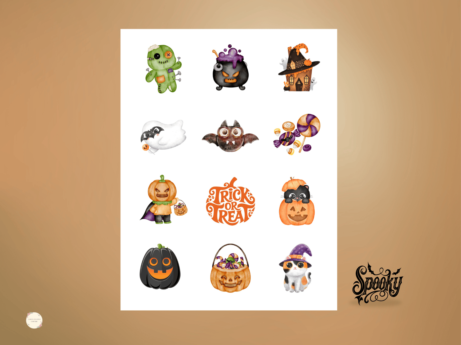 Bring a little spooky-cute charm to your crafts with these adorable watercolor Halloween stickers! Featuring a friendly ghost, black cat inside a pumpkin, and playful pumpkins, these designs are perfect for planners, scrapbooks, treat bags, and DIY cards. Youβll receive both a ready-to-print sheet and individual PNGs, so you can use them however you like.