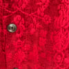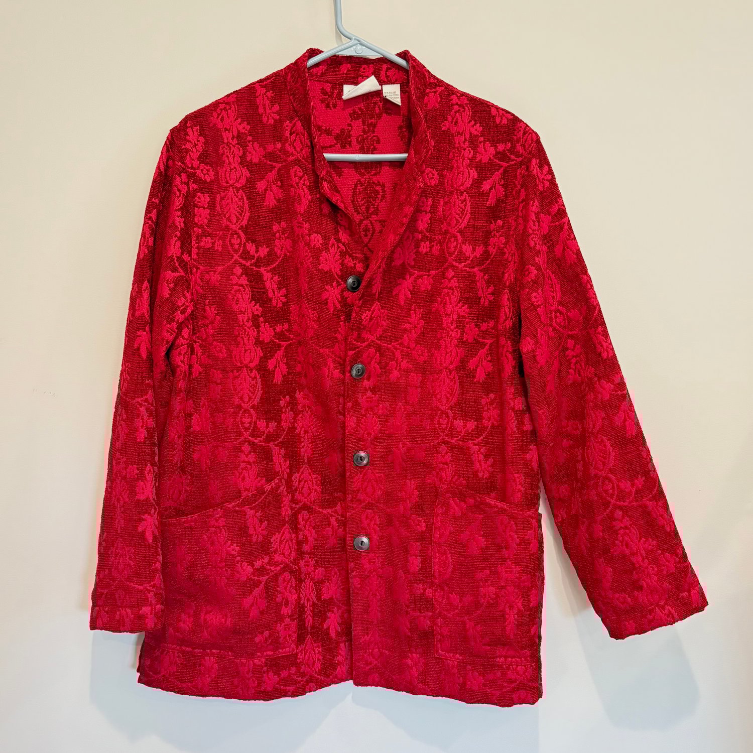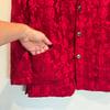 Chico’s Design red jacquard textured floral fabric cardigan or jacket with pockets and metal buttons.
