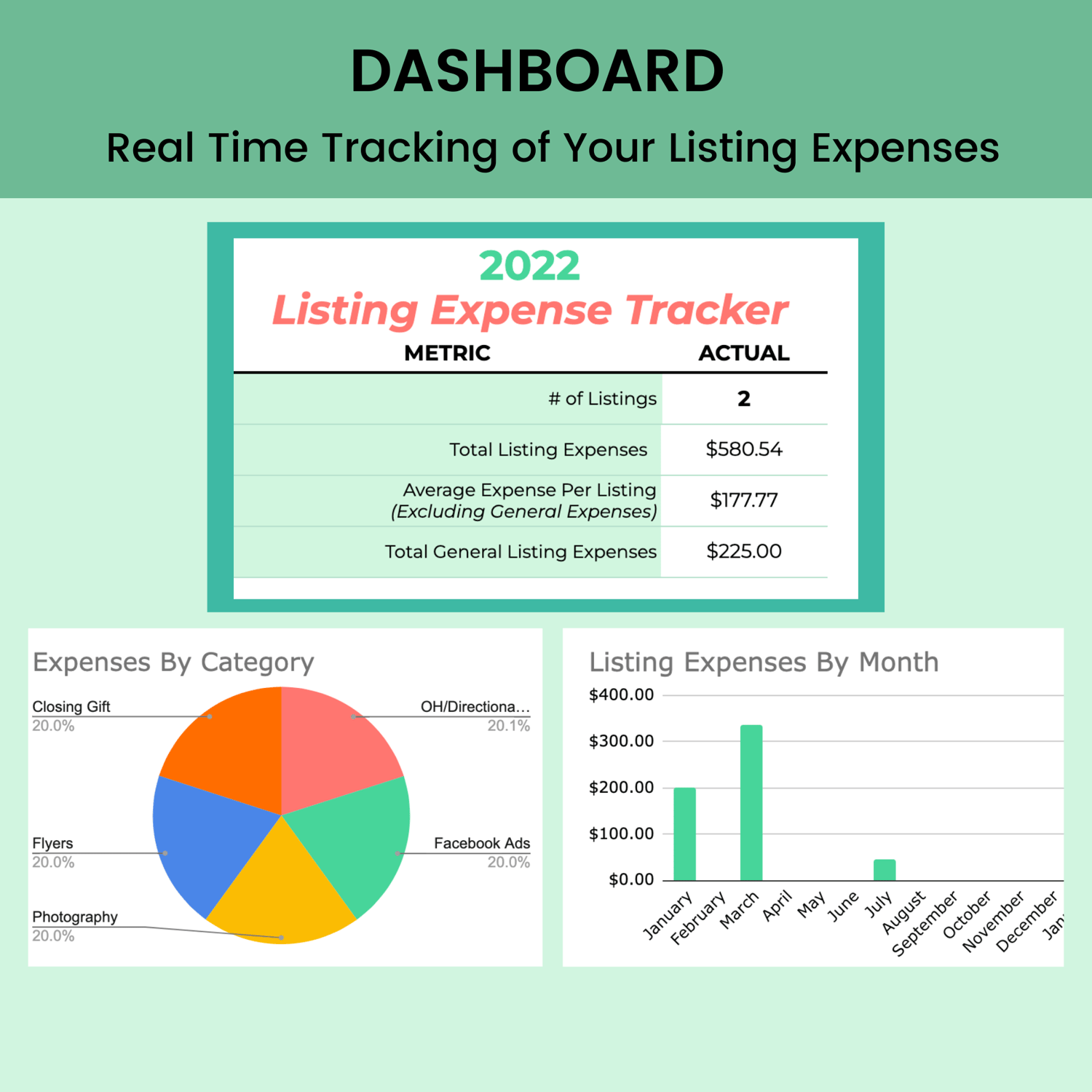 This Google Sheets Real Estate Listing Expense Tracker allows you to keep track of your expenses for your listings. You can track expenses by property, general listing expenses, and the total expenses for the year. Keep your business running smoothly and efficiently by identifying your biggest expense categories.
