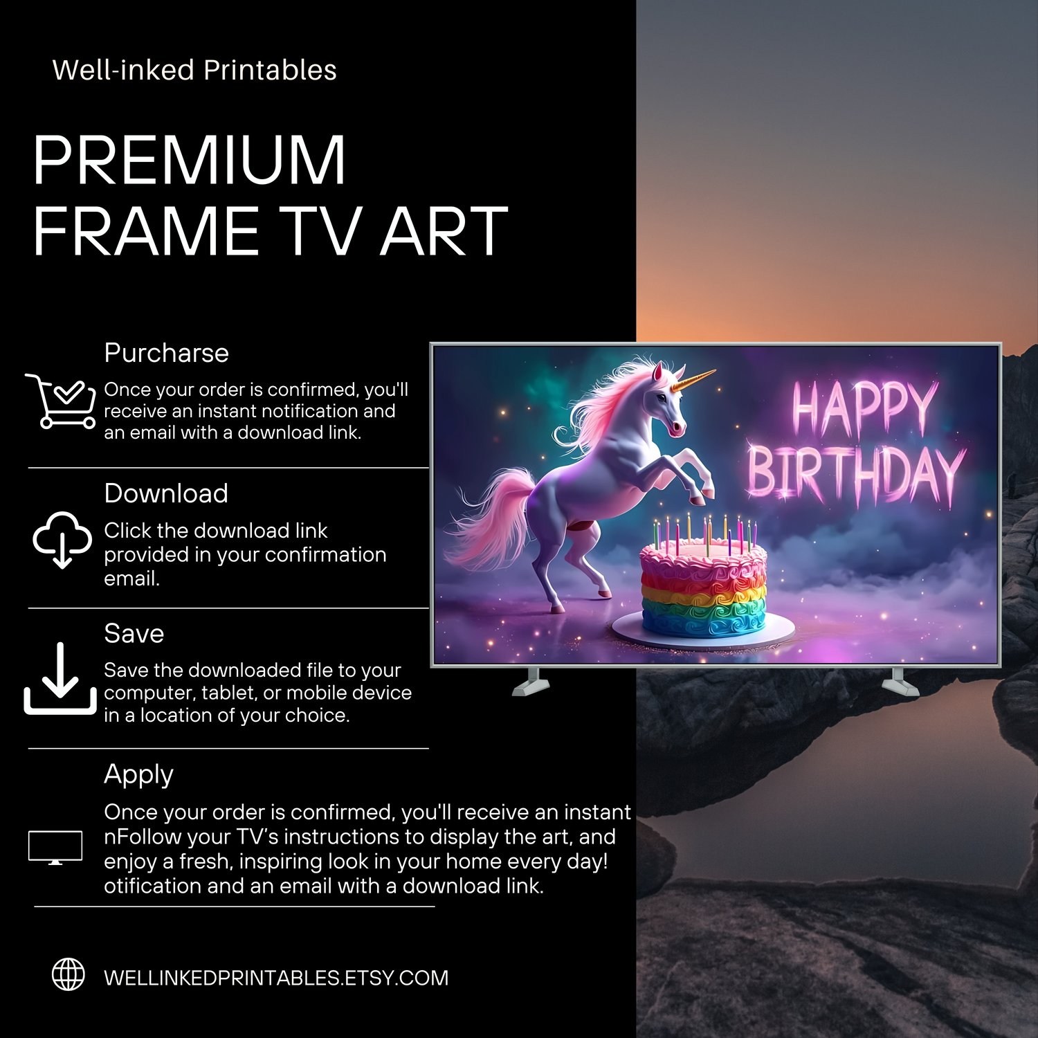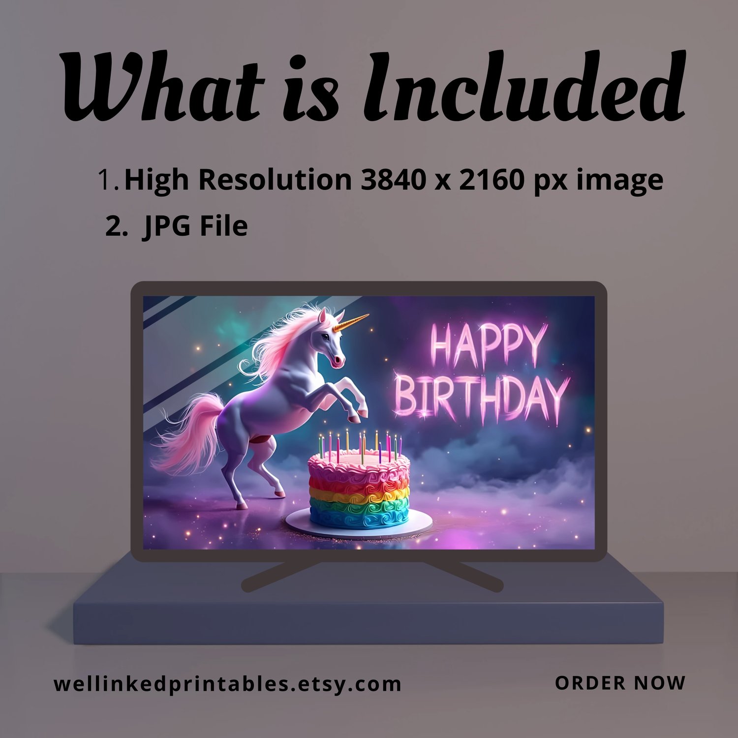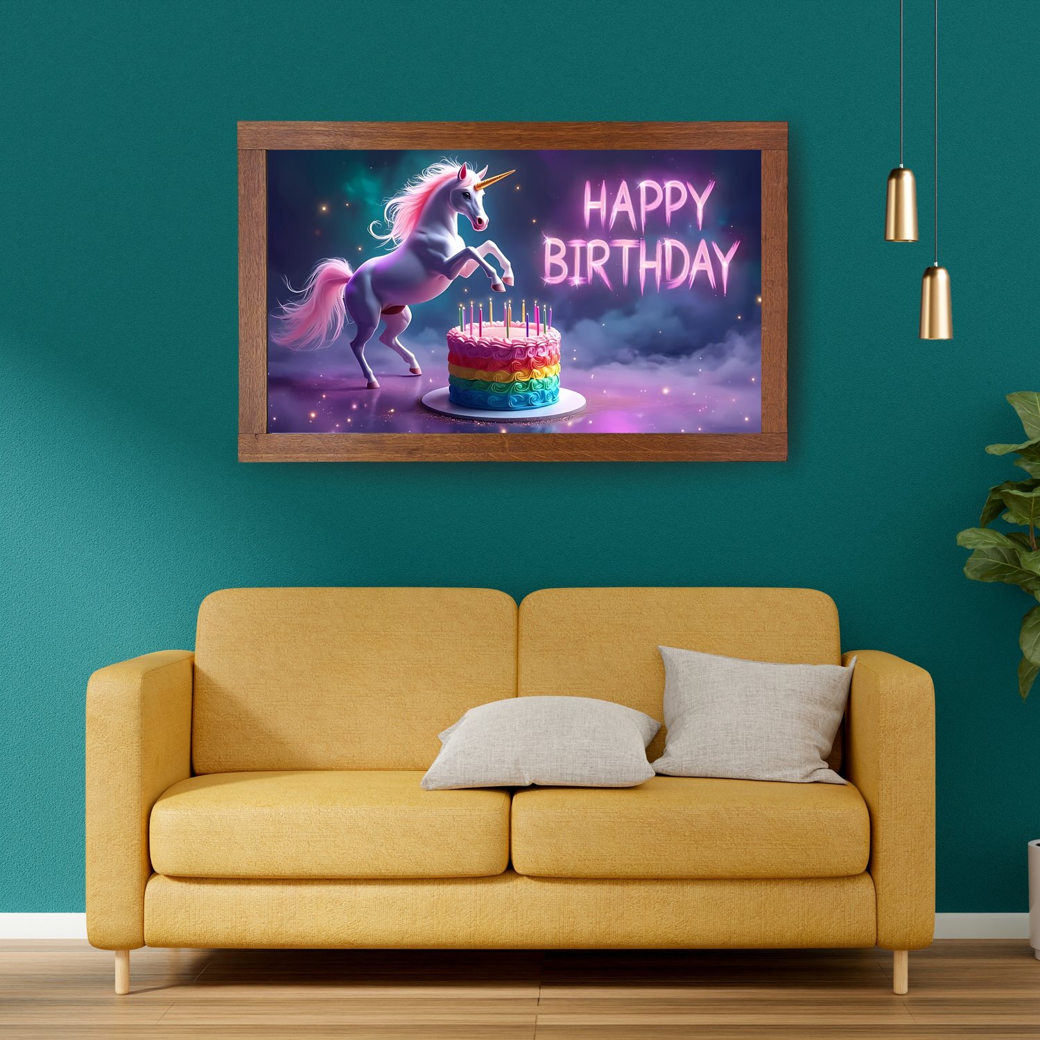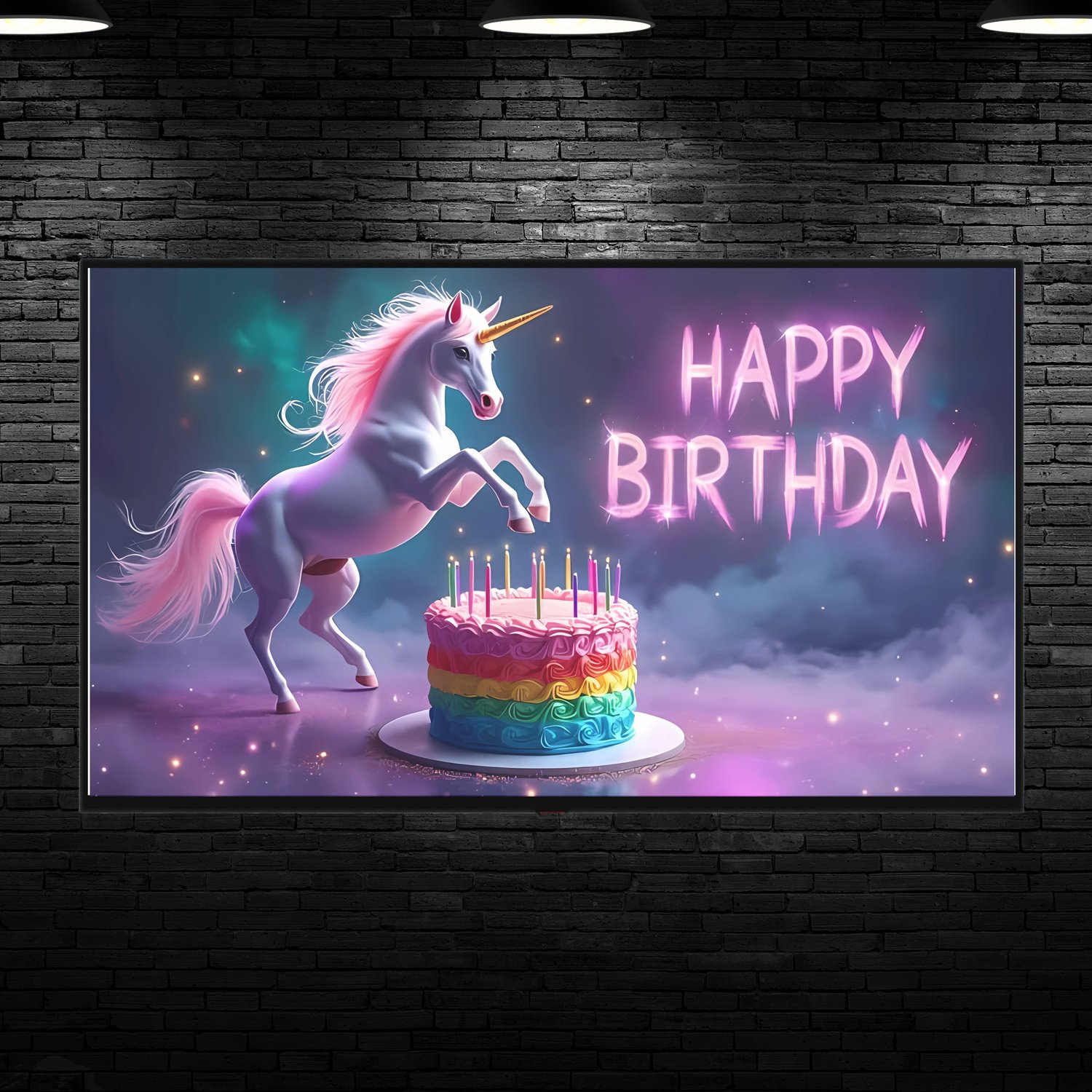 Celebrate birthdays with a splash of magic and stardust using this Cosmic Unicorn Birthday Art! Featuring a majestic unicorn leaping over a rainbow layer, its iridescent mane trailing into swirling nebulas and glittering stars, this design blends fantasy and cosmic wonder. Perfect for Samsung Frame TVs, party backdrops, or digital displays, it’s a showstopping way to enchant kids and adults alike!