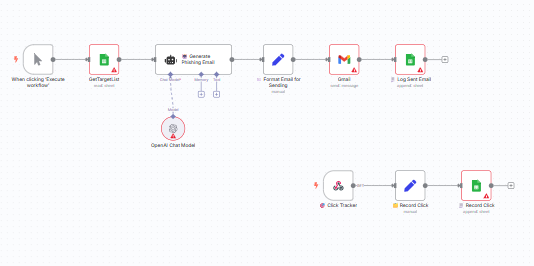 Simulate phishing awareness campaigns using OpenAI-generated emails. Send to target lists, log clicks with a webhook, and store results in Google Sheets. Built for internal testing and cyber awareness training.