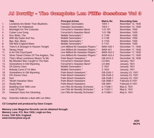 We present the third cvolume of recordings that Al Bowlly made with various Len Fillis studio groups. Many rarities here.