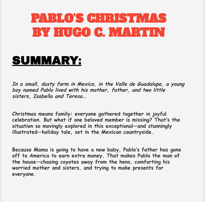 This 35 page ready-to-use, no prep unit was created to use with Pablo's Christmas by Hugo C. Martin. It is a beautiful story about a boy named Pablo and his family in Mexico, and how he saves Christmas for them.