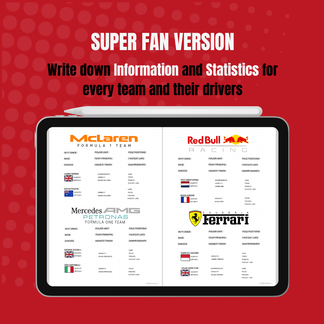 As an avid F1 fan myself, I love looking back on races, tracking my favorite drivers' performances, and noting key moments throughout the season. That’s why I created this race journal—so you can capture every highlight and statistic in one beautifully designed digital notebook! Each page was designed from scratch by me, as well as all the titles, team names and the country flags.