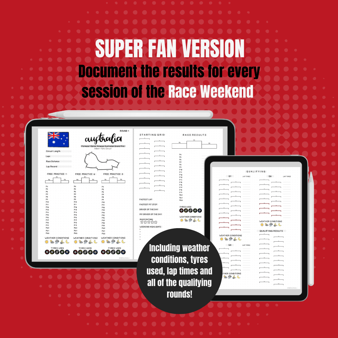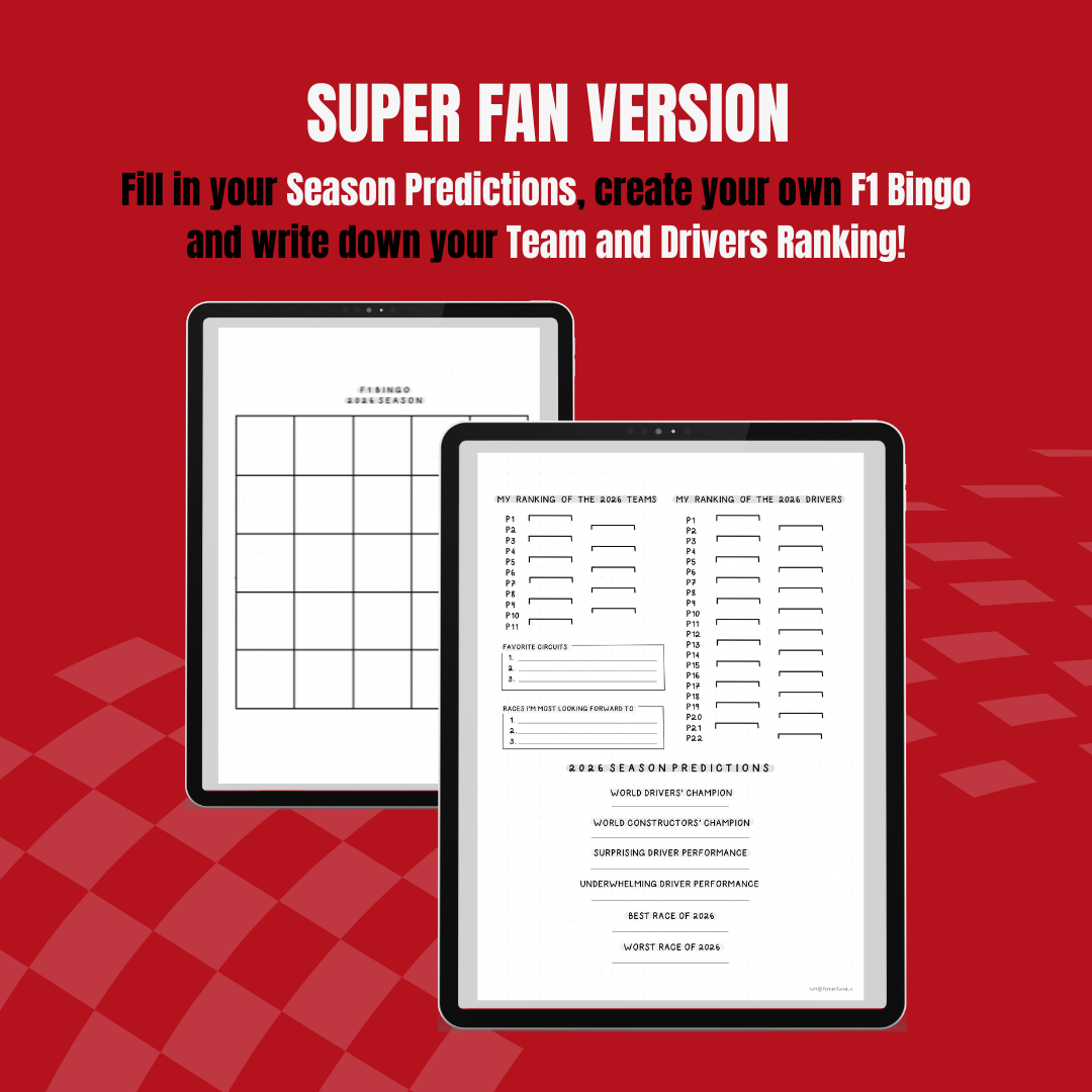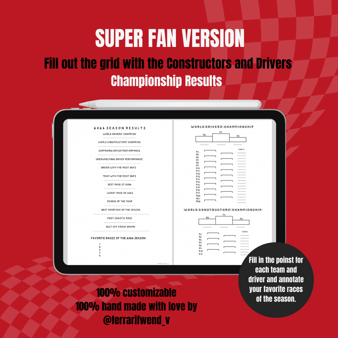 Are you a true Formula 1 Super Fan? This Digital Race Journal is designed to help you document every detail of the 2026 season! Whether you're tracking lap times, weather conditions, or race highlights, this journal ensures nothing goes unnoticed.