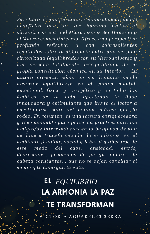 Esta obra que tienes en tus manos es el fruto de una investigación realizada por la Autora a lo largo de 30 años en la cual los beneficios recibidos por ella misma y por todas las personas a las que se lo ha compartido han sido siempre satisfactorios, pudiendo cada una de estas personas desprenderse de toda clase de situaciones difíciles en el ámbito de la vida como problemas personales, familiares, con hijos problemáticos, en el trabajo, en el ámbito de las parejas, en las empresas y en los adolescentes con problemas extremos.