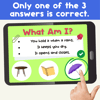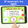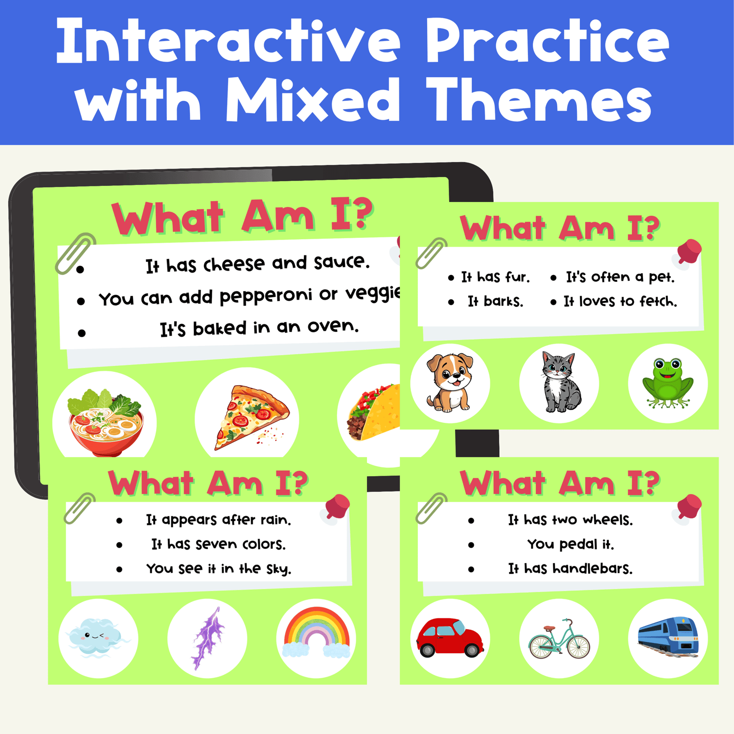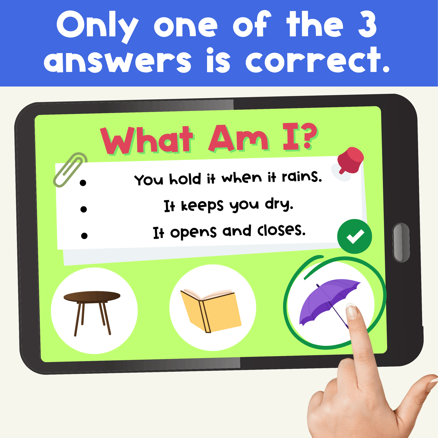 Students read a set of short, descriptive clues and select the one word that fits them all — turning language practice into a fun digital game.