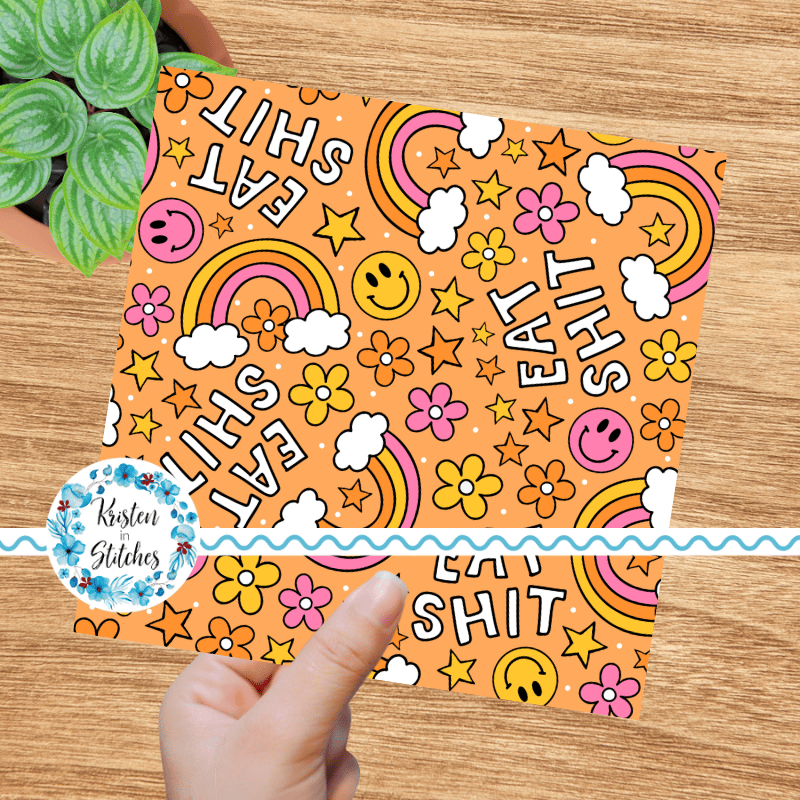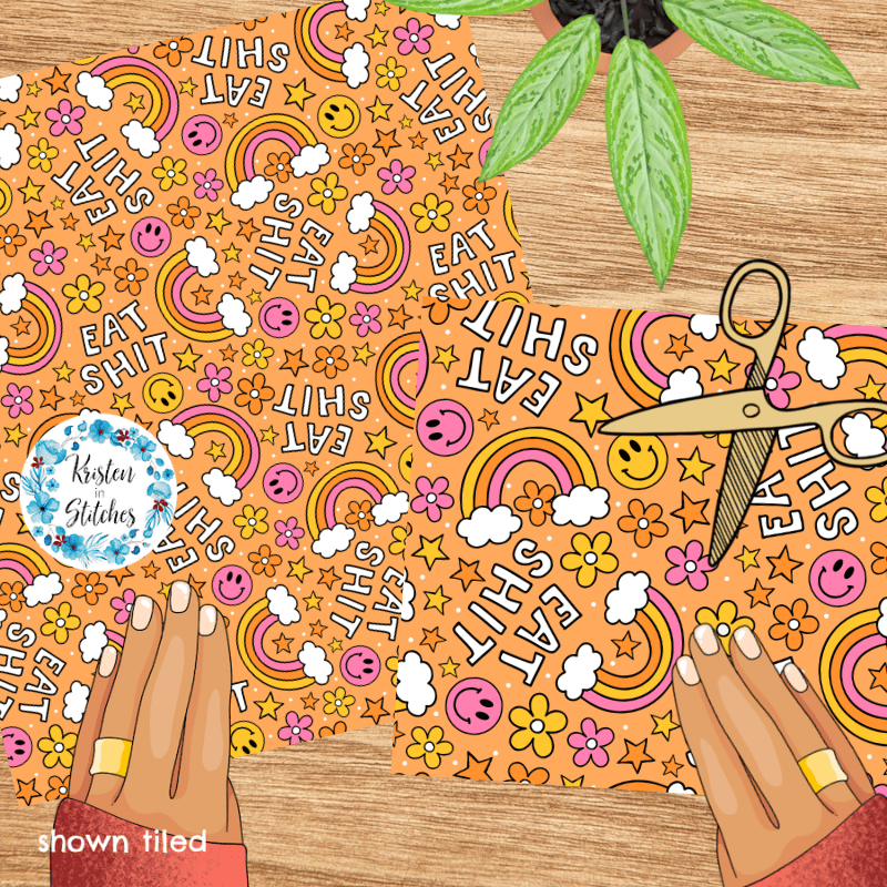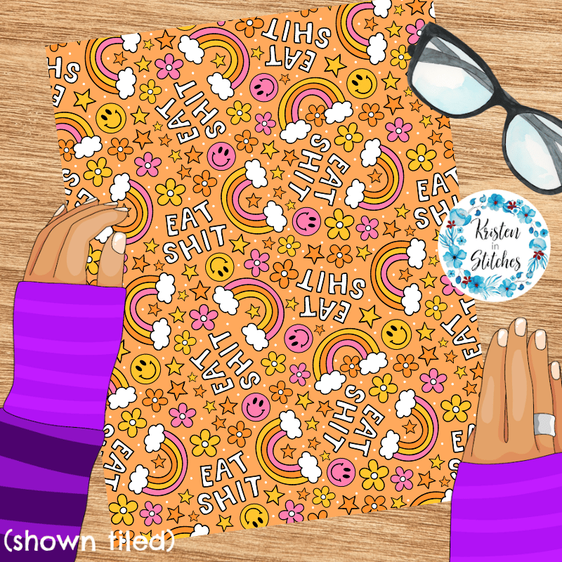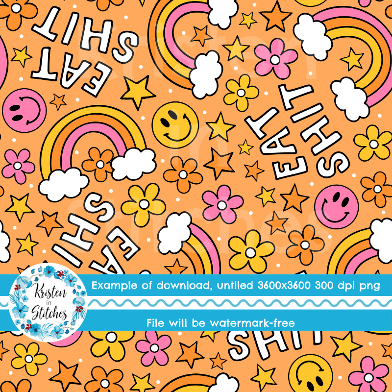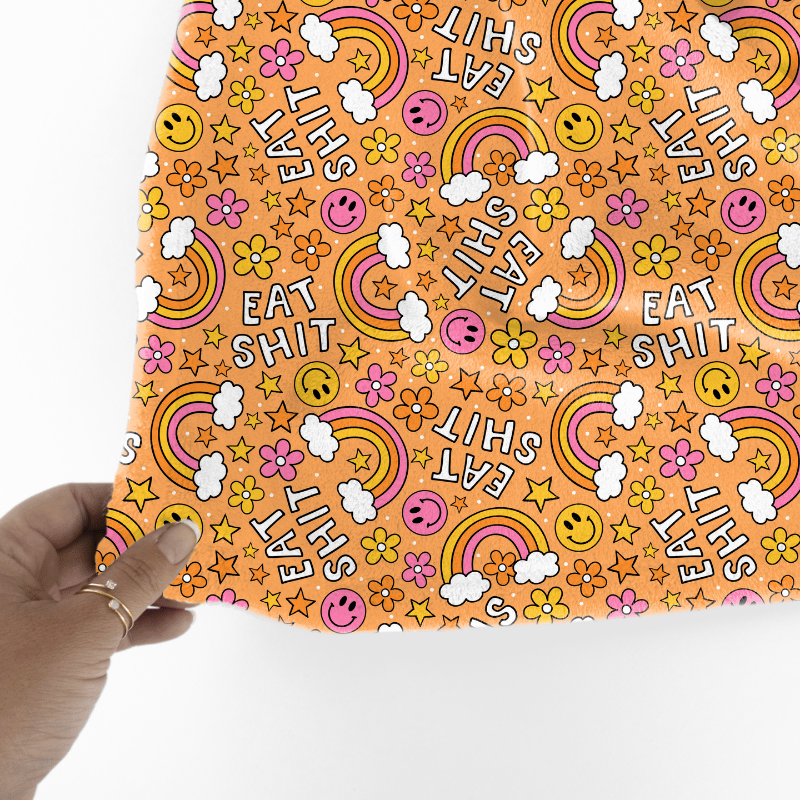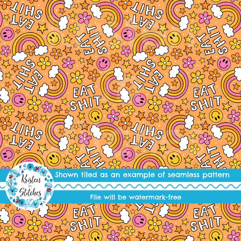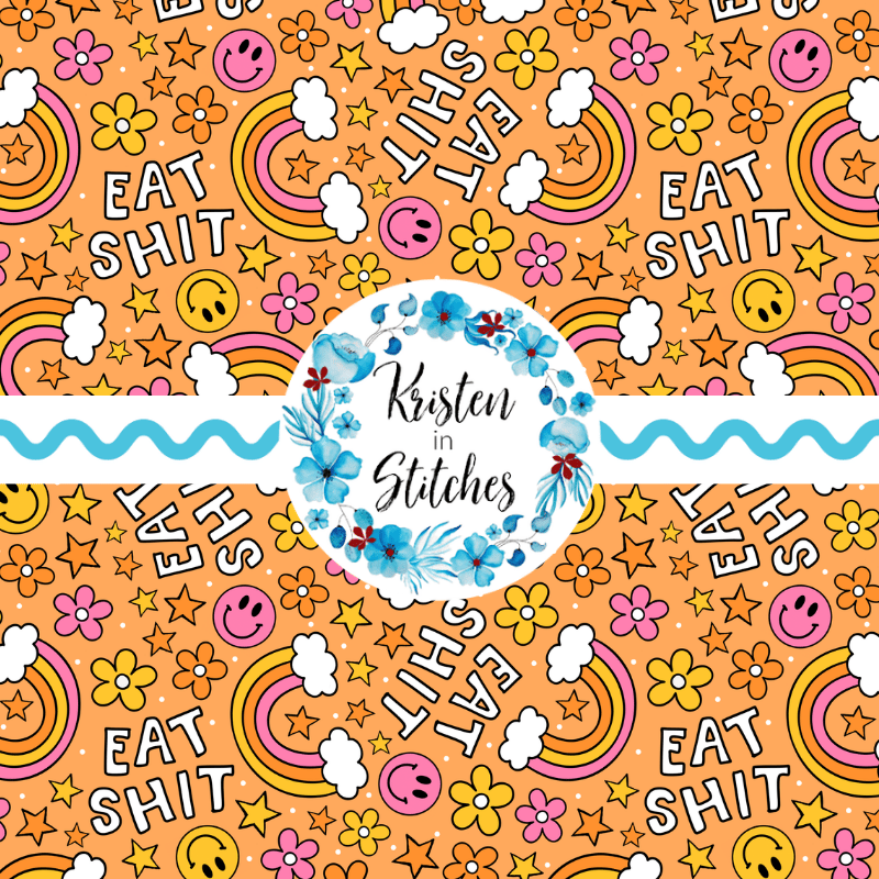 Eat Shit Sarcastic Sweary Seamless Pattern, Rainbows and Flowers, Orange