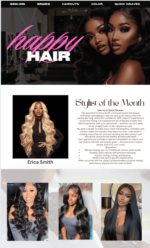 Give your salon or beauty brand a stunning, professional upgrade with the Happy Hair Salon Website Template! Designed for hairstylists, braiders, wig specialists, and beauty professionals, this template delivers a clean, modern, luxury aesthetic that instantly elevates your online presence.